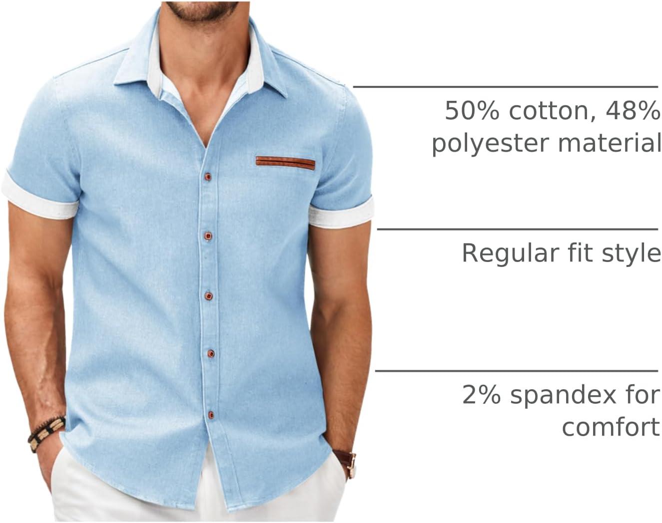COOFANDY Men’s Cotton Casual Short Sleeve Button Down Shirt Plaid Collar Denim Work Shirts(B – Clear Blue – No Pocket)