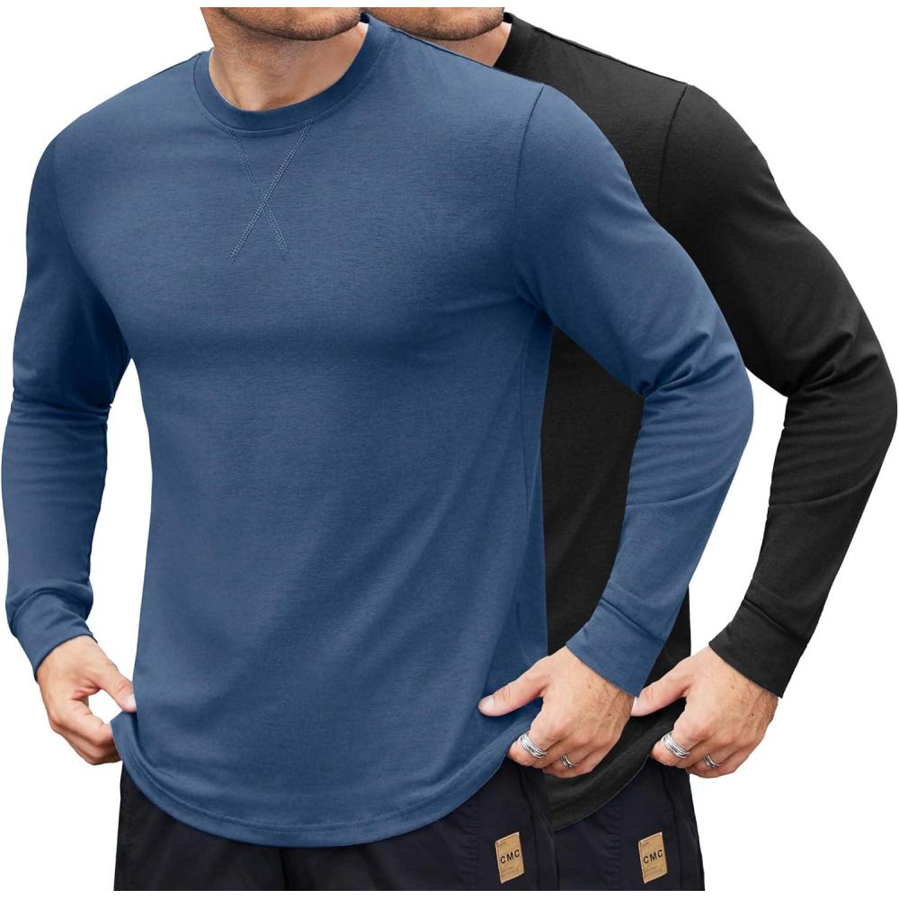 COOFANDY Mens Cotton Hipster Hip Hop Longline Crewneck T Shirts Casual Long Sleeve Tees Curved Hem Gym Shirts(Two Pack- Black + Blue)