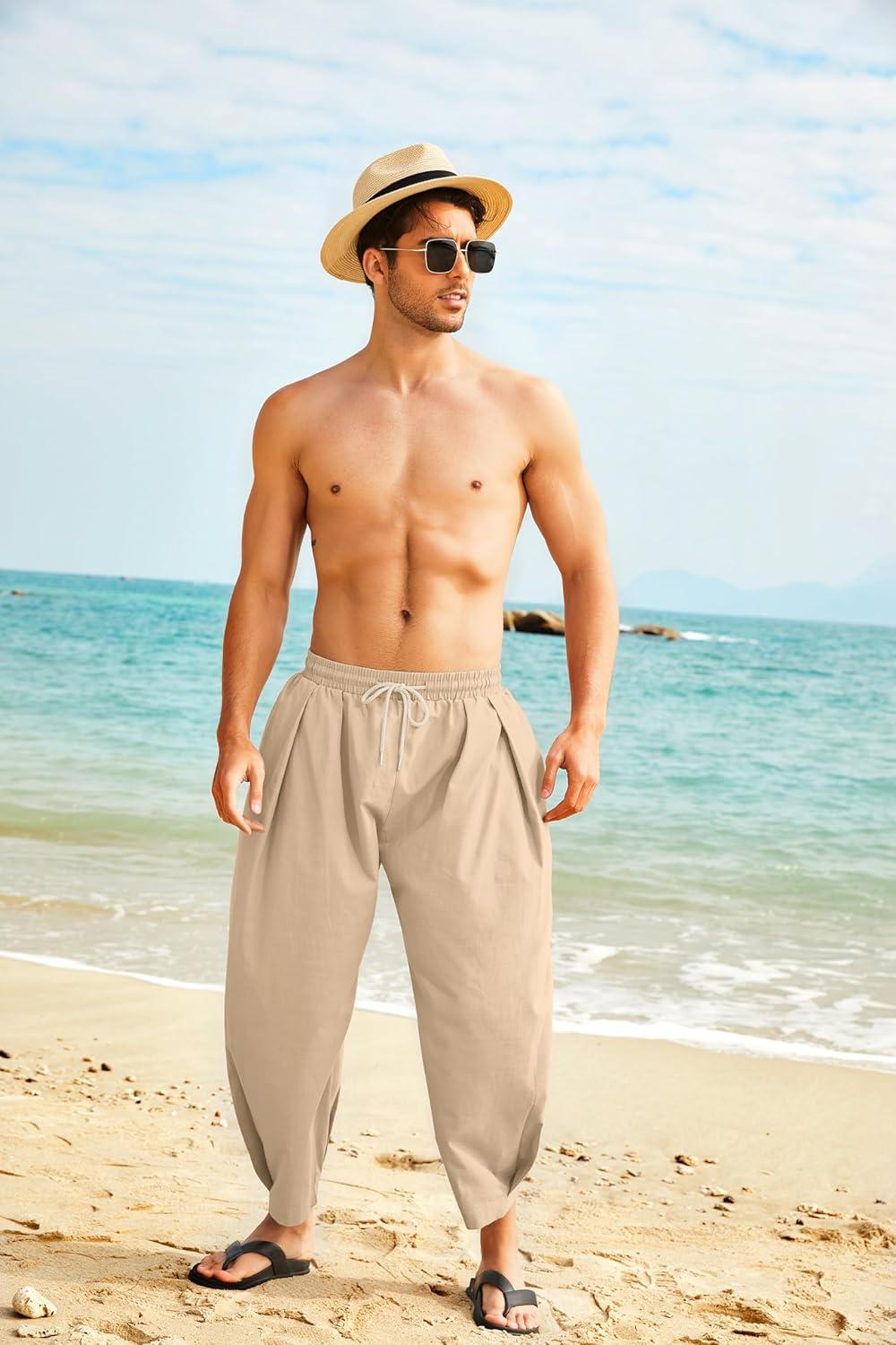 COOFANDY Men's Cotton Linen Harem Pants Drawstring Casual Cropped Trousers Lightweight Loose Beach Yoga Pants with Pockets(Light Brown)