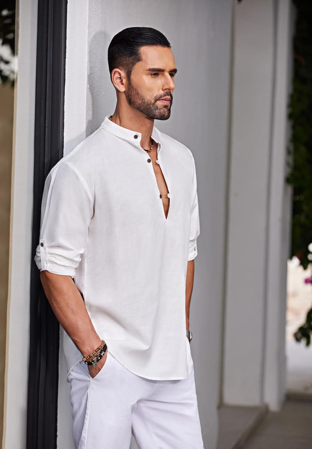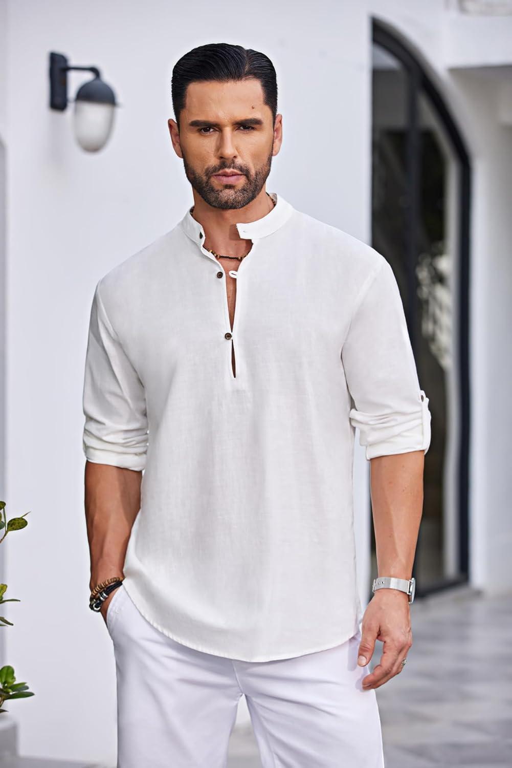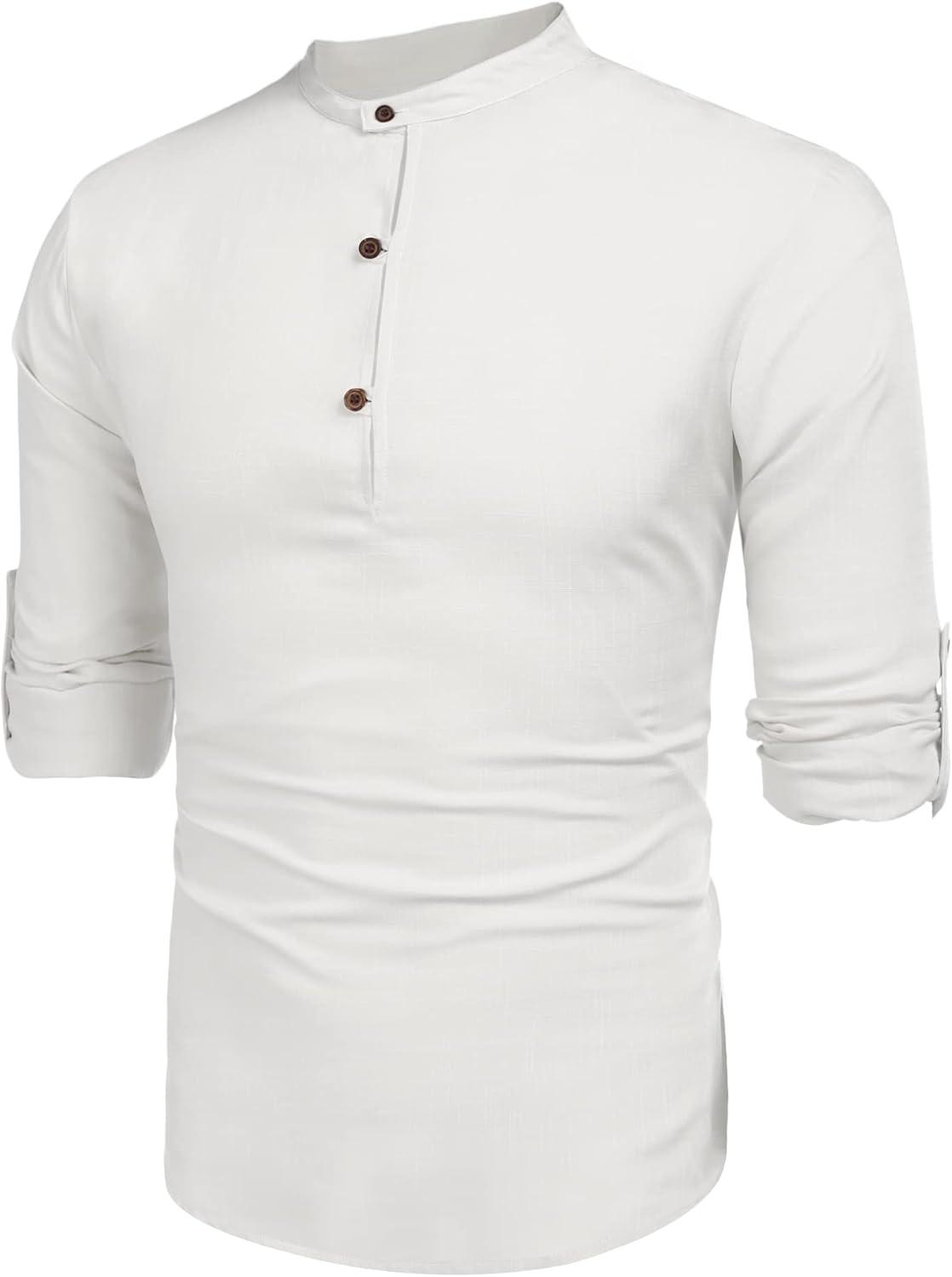 COOFANDY Men's Cotton Linen Henley Shirt Casual Beach Hippie Shirts Long Sleeve T-Shirts(A_white)