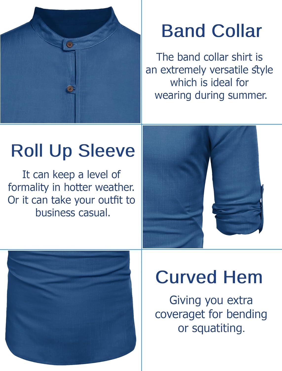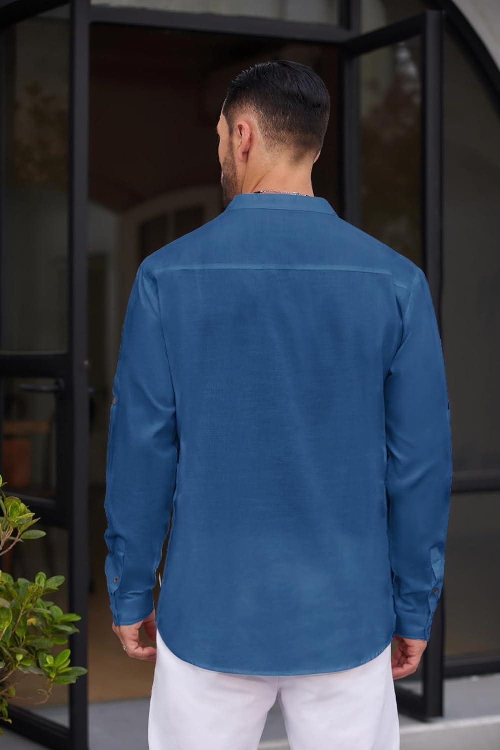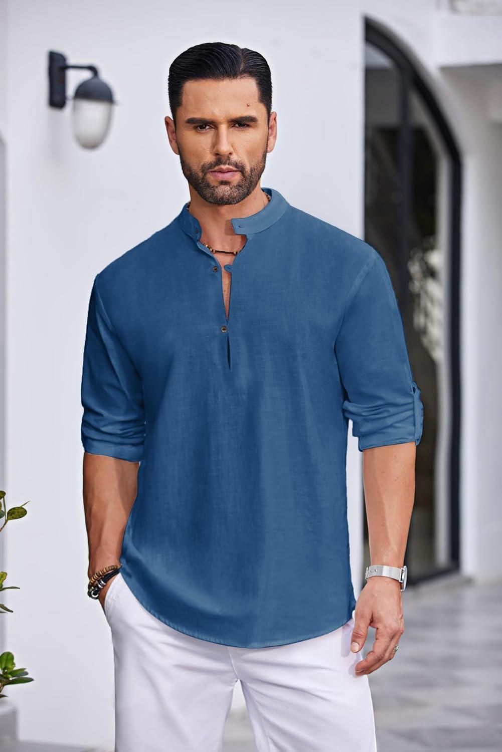 COOFANDY Men's Cotton Linen Henley Shirt Casual Beach Hippie Shirts Long Sleeve T-Shirts(Dark Blue)