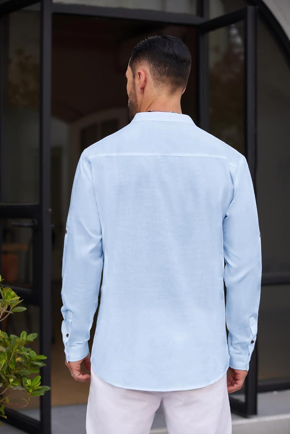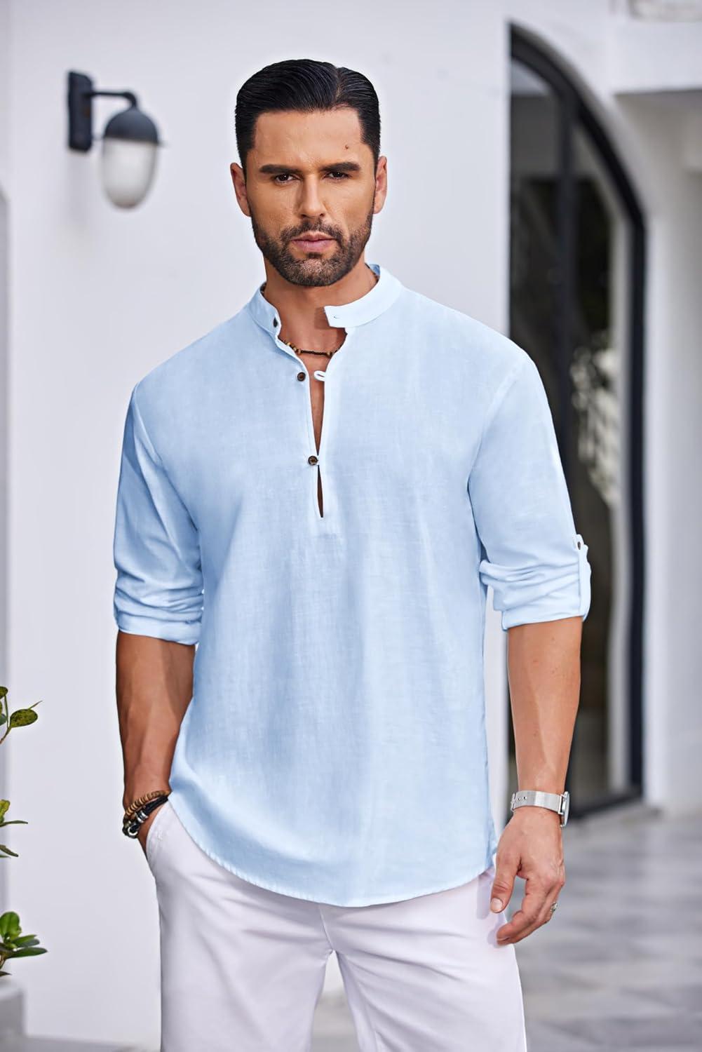 COOFANDY Men's Cotton Linen Henley Shirt Casual Beach Hippie Shirts Long Sleeve T-Shirts(Light Blue)