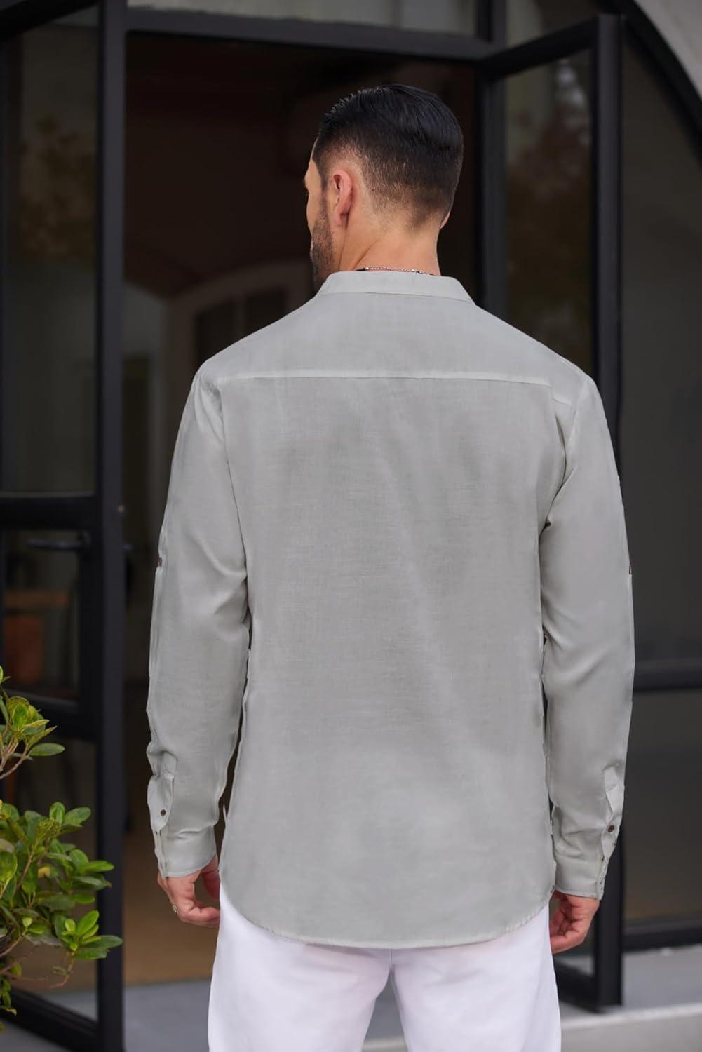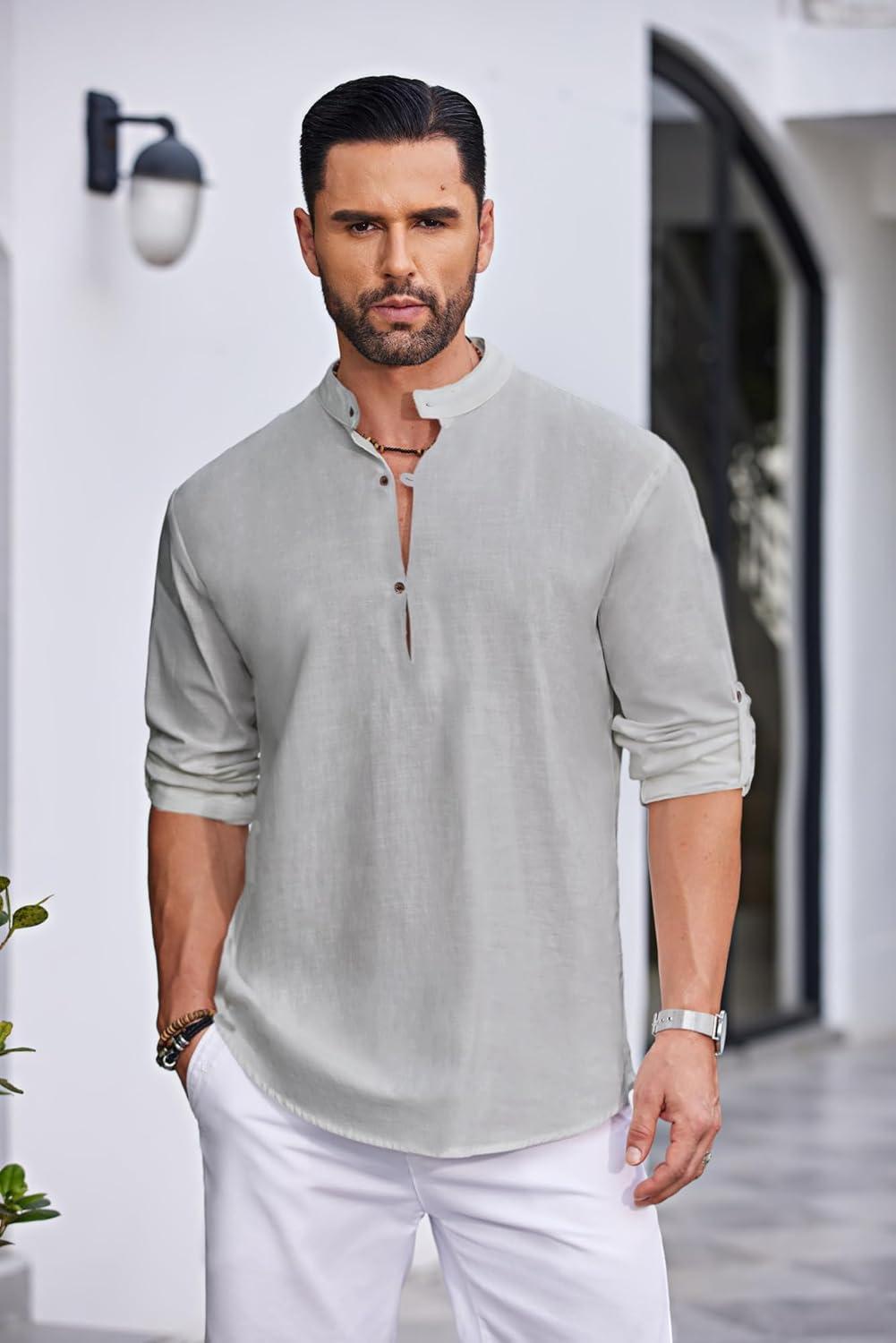 COOFANDY Men's Cotton Linen Henley Shirt Casual Beach Hippie Shirts Long Sleeve T-Shirts(Light Grey)