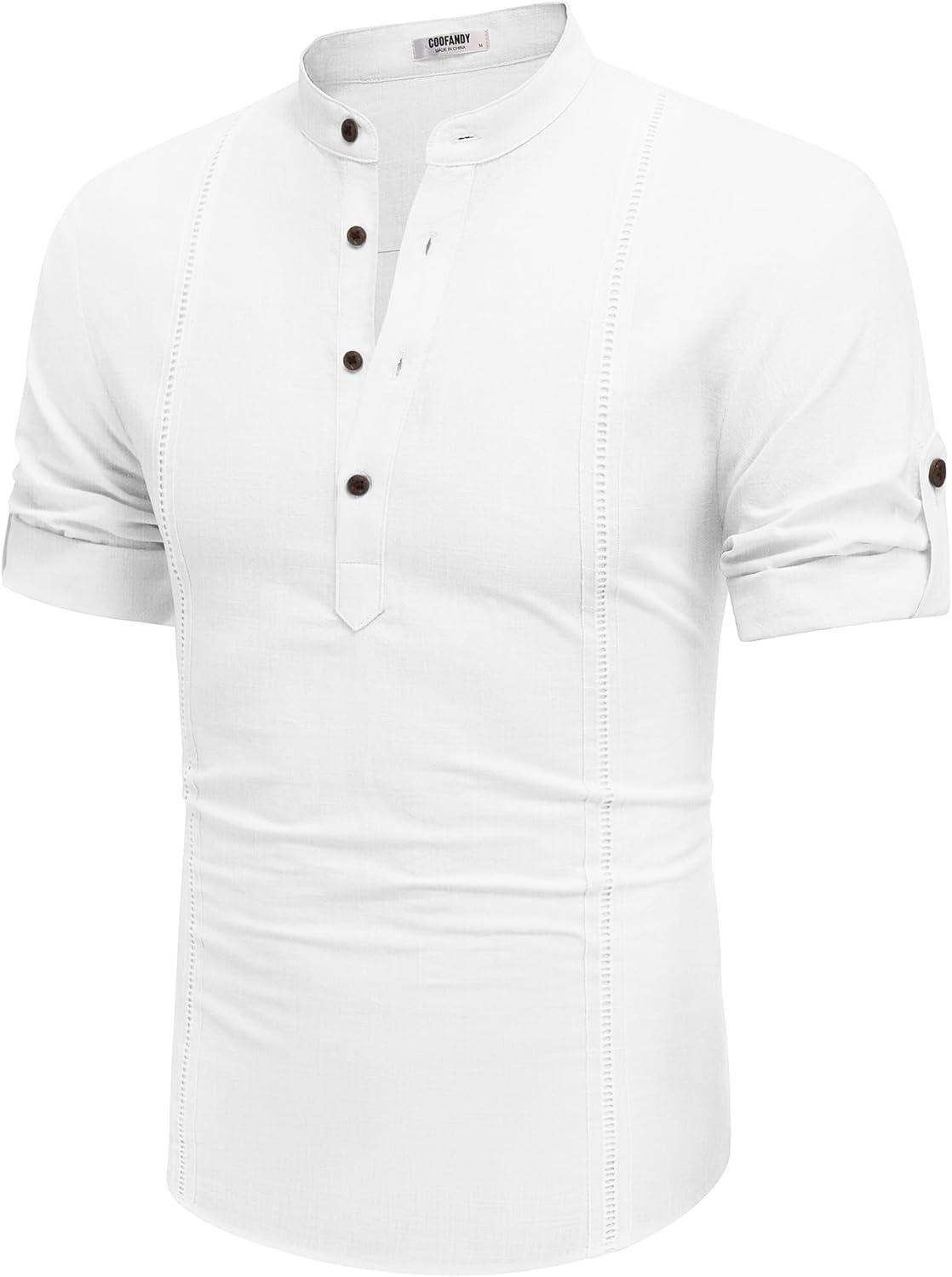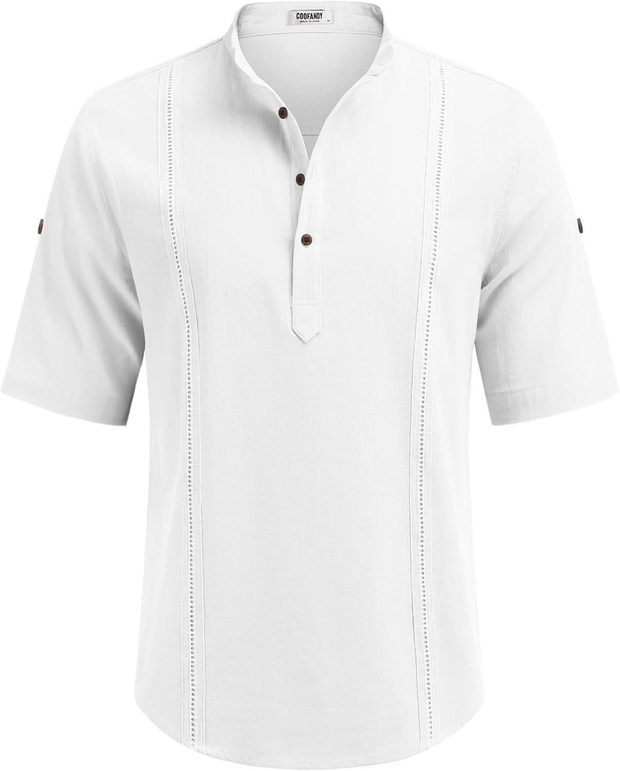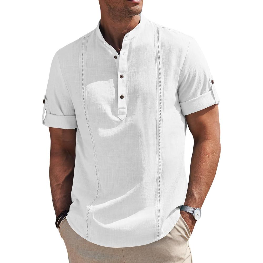 COOFANDY Men’s Cotton Linen Henley Shirt Short Sleeve Hippie Casual Band Collar Summer Beach T-Shirts(A-white)