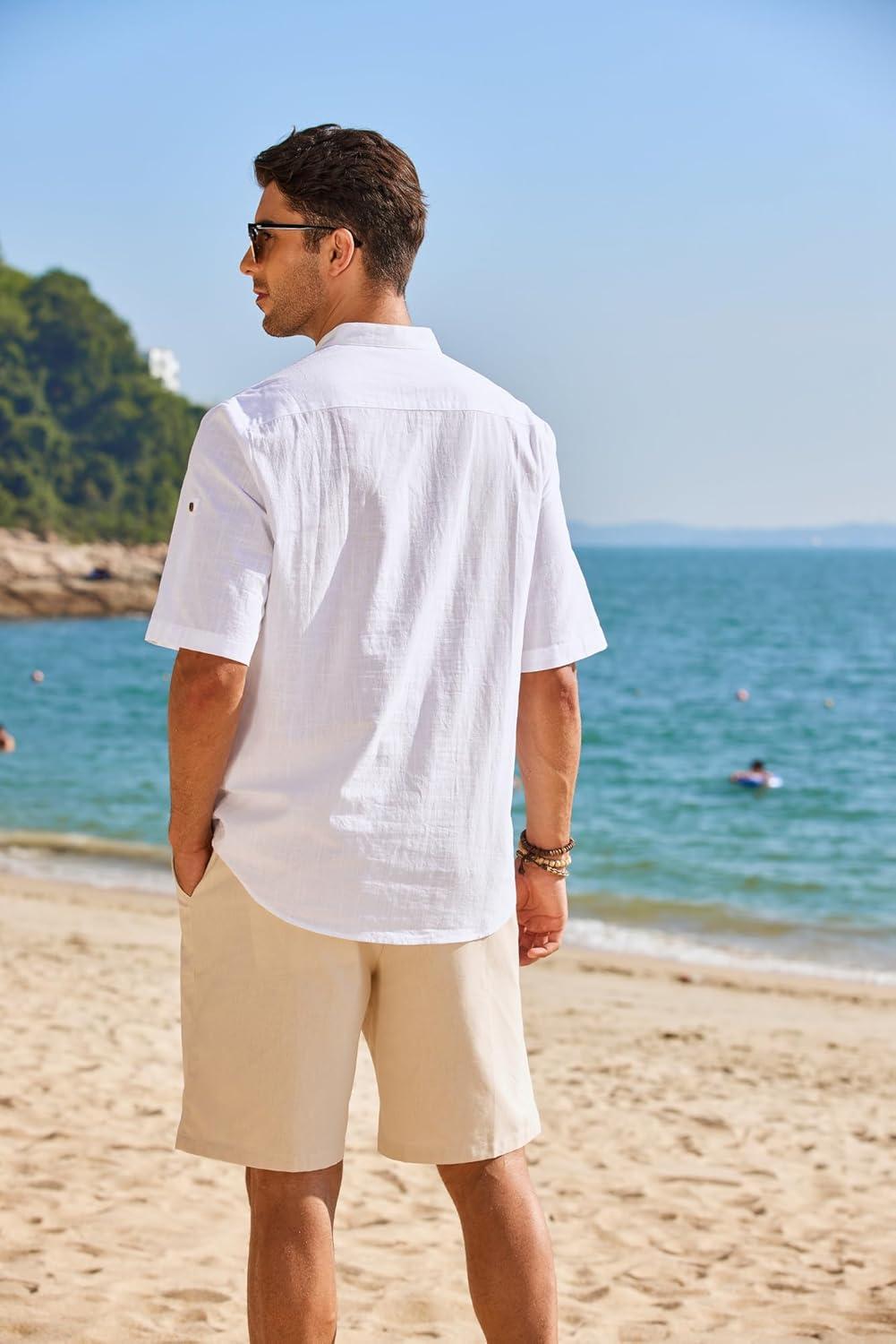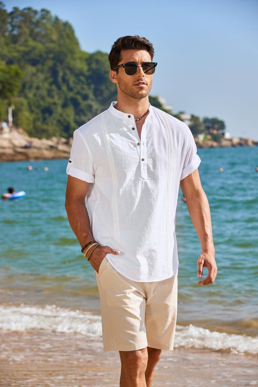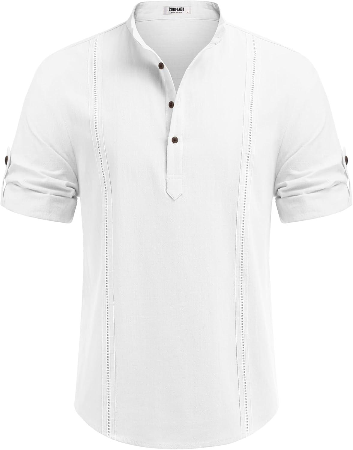 COOFANDY Men’s Cotton Linen Henley Shirt Short Sleeve Hippie Casual Band Collar Summer Beach T-Shirts(A-white)
