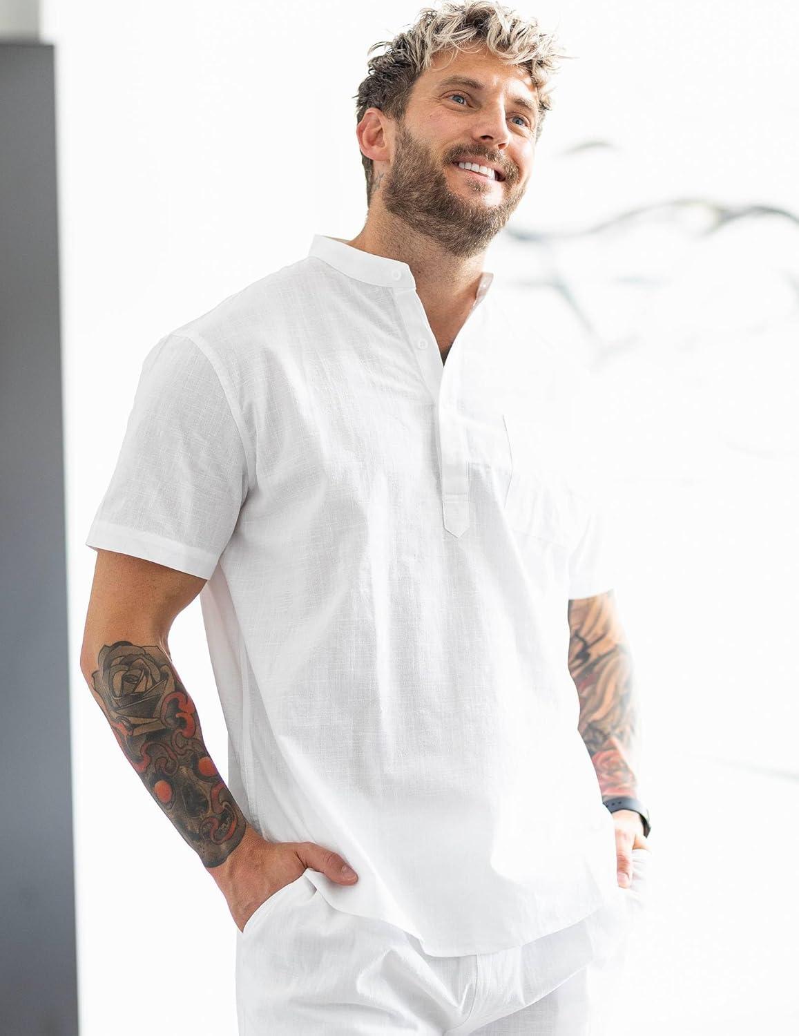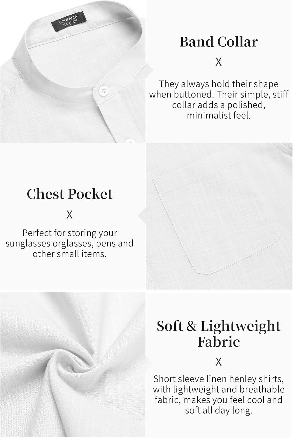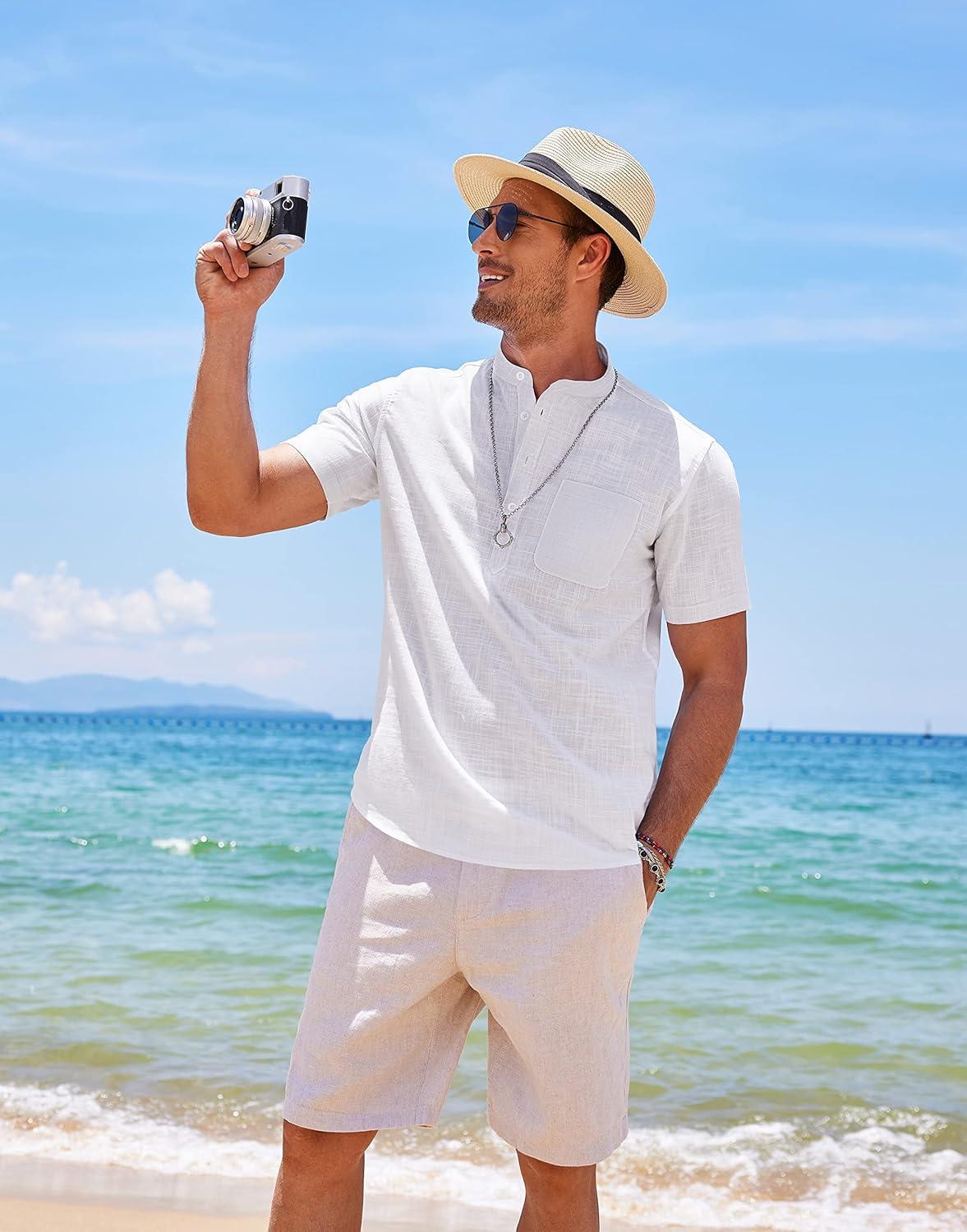 COOFANDY Men’s Cotton Linen Henley Shirt Short Sleeve Hippie Casual Beach T-Shirts with Pocket(01-white)