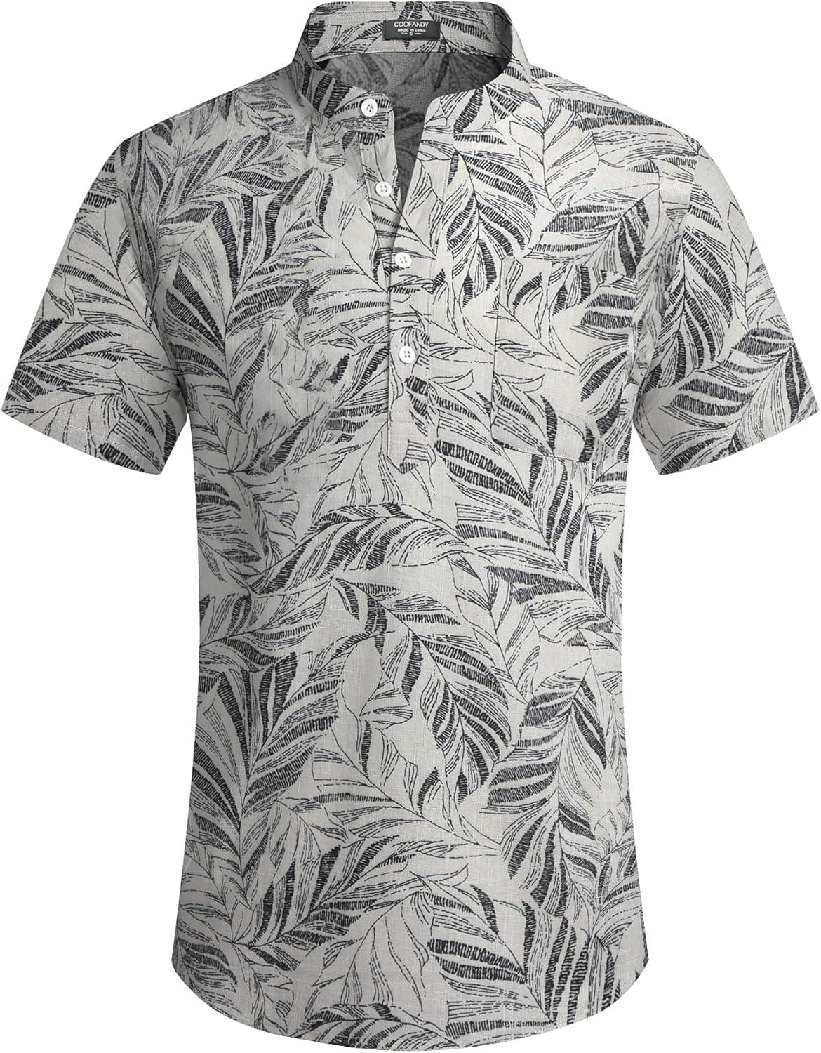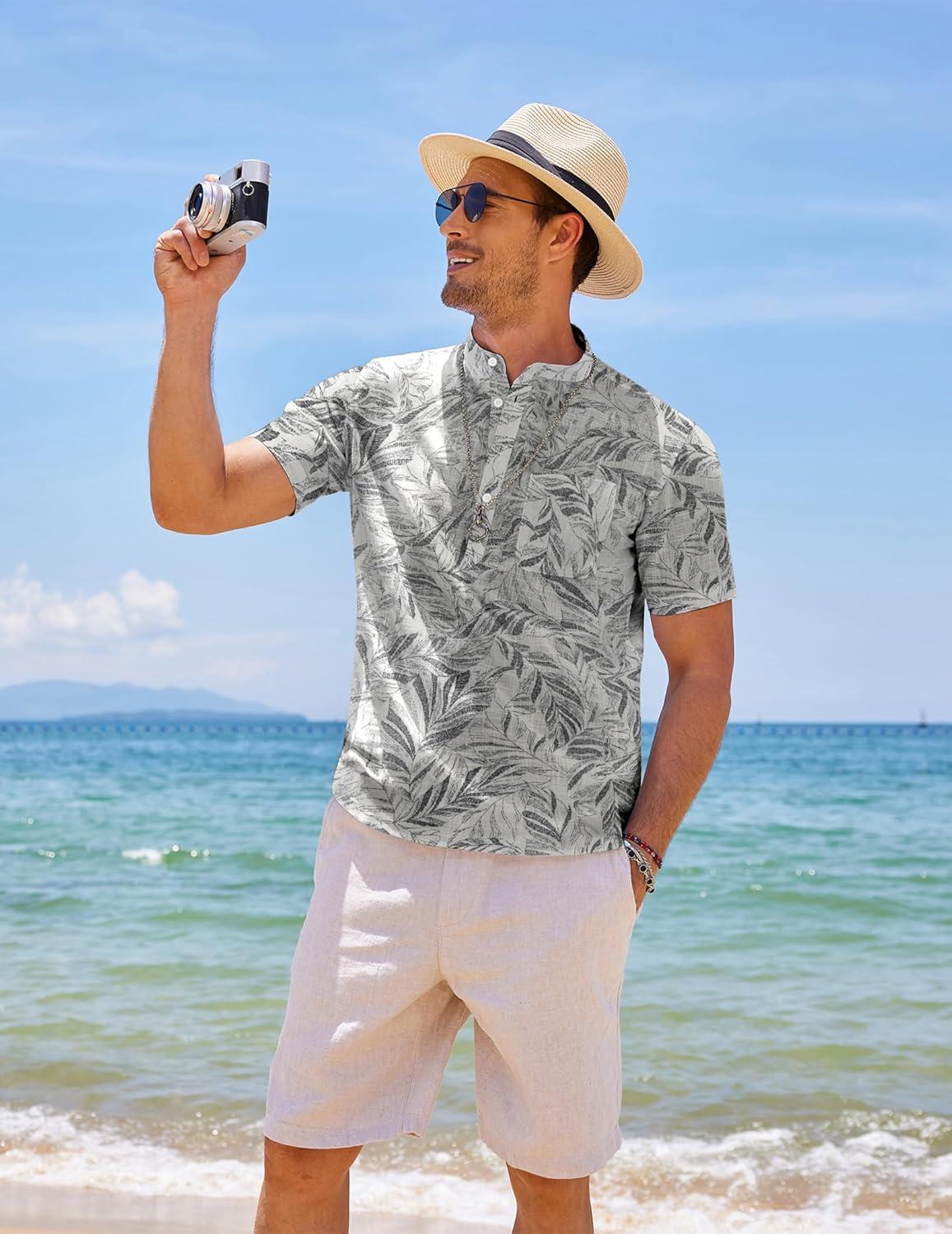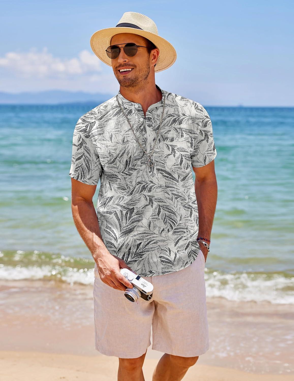 COOFANDY Men's Cotton Linen Henley Shirt Short Sleeve Hippie Casual Beach T-Shirts with Pocket(Apricot Black - Plant Leaves)