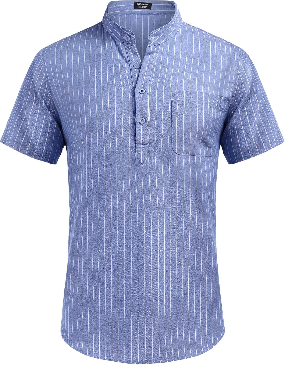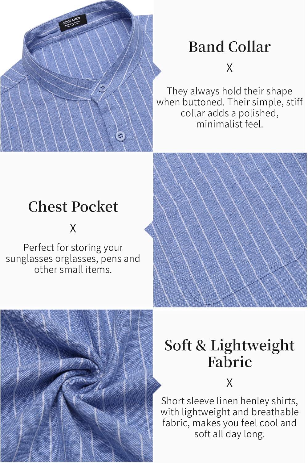 COOFANDY Men's Cotton Linen Henley Shirt Short Sleeve Hippie Casual Beach T-Shirts with Pocket(Blue Striped)