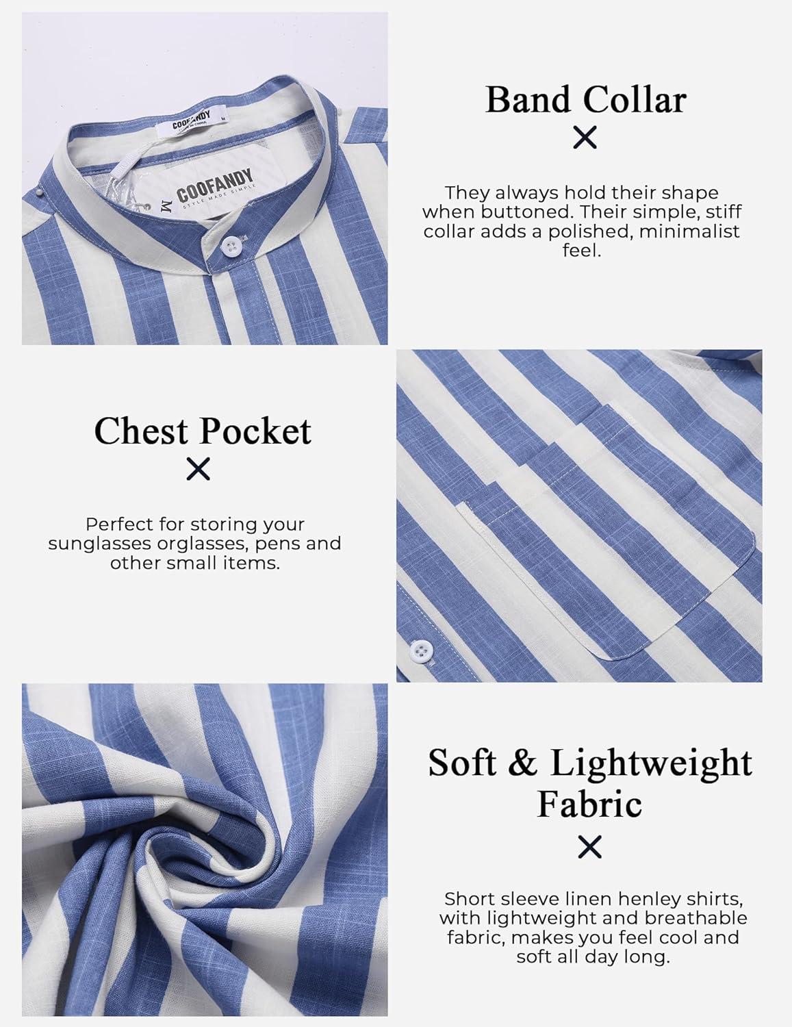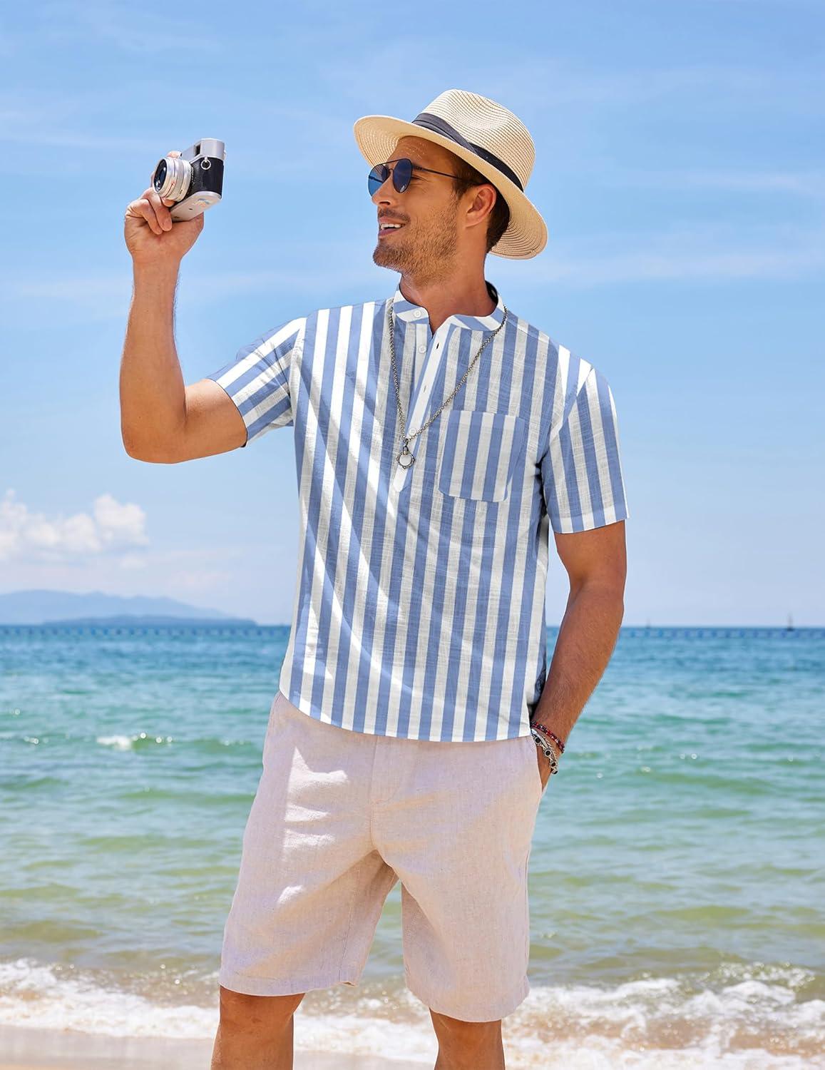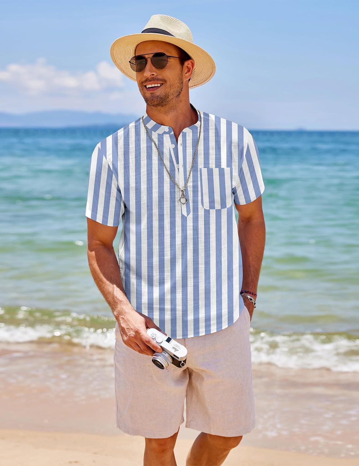 COOFANDY Men’s Cotton Linen Henley Shirt Short Sleeve Hippie Casual Beach T-Shirts with Pocket(Blue-white Vertical Stripes)