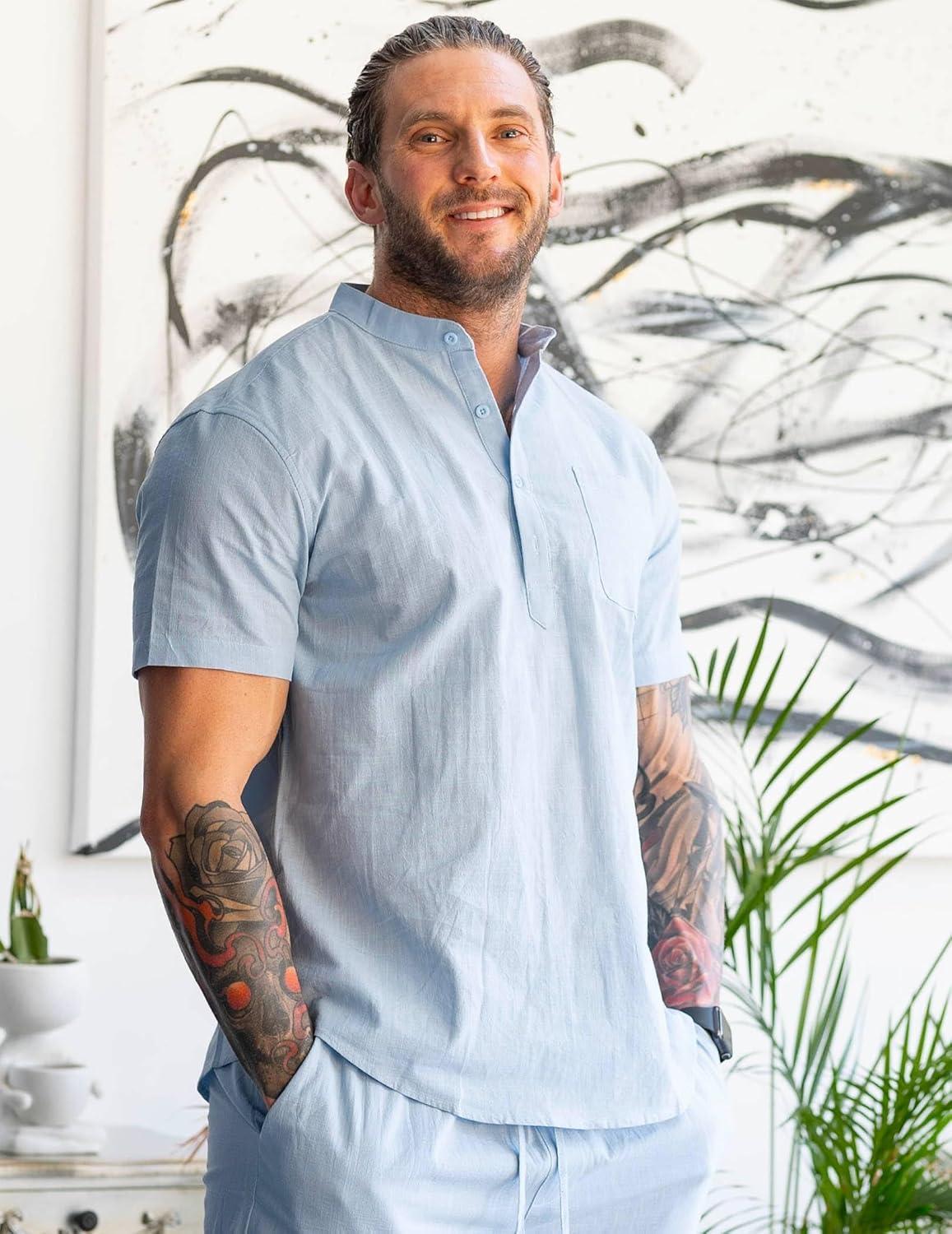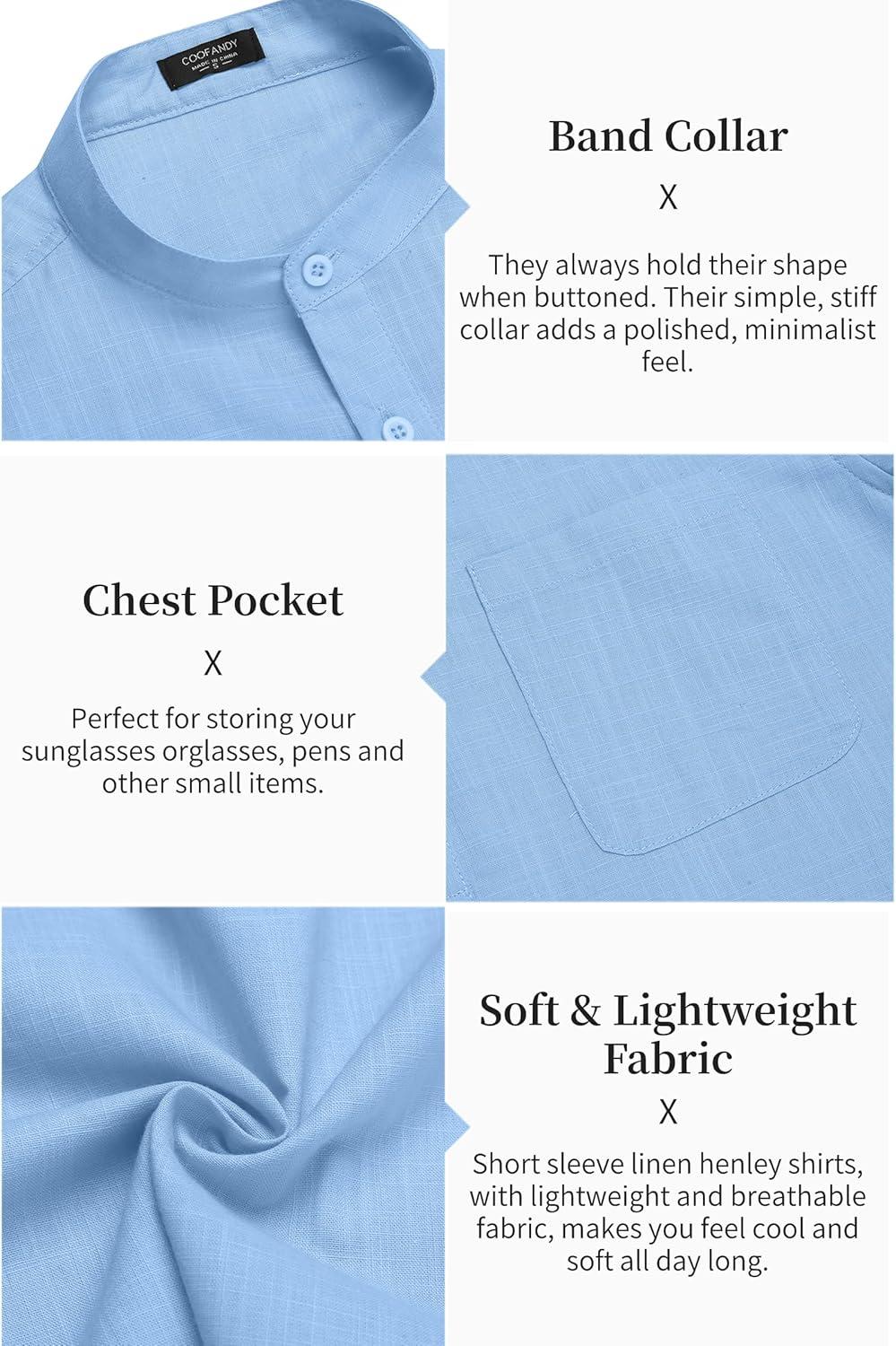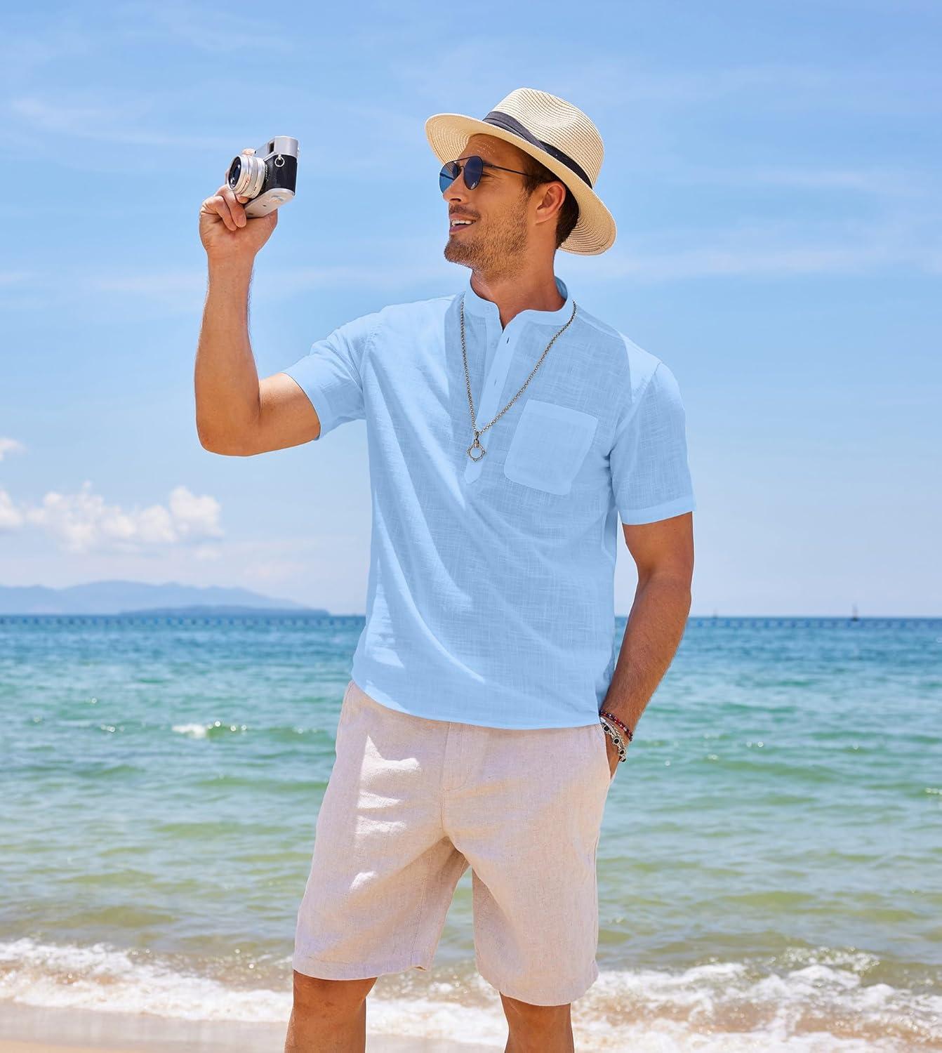 COOFANDY Men’s Cotton Linen Henley Shirt Short Sleeve Hippie Casual Beach T-Shirts with Pocket(Denim Blue)