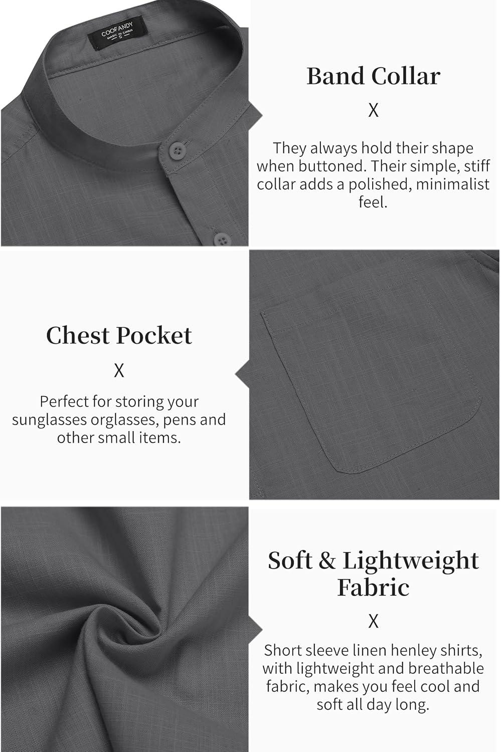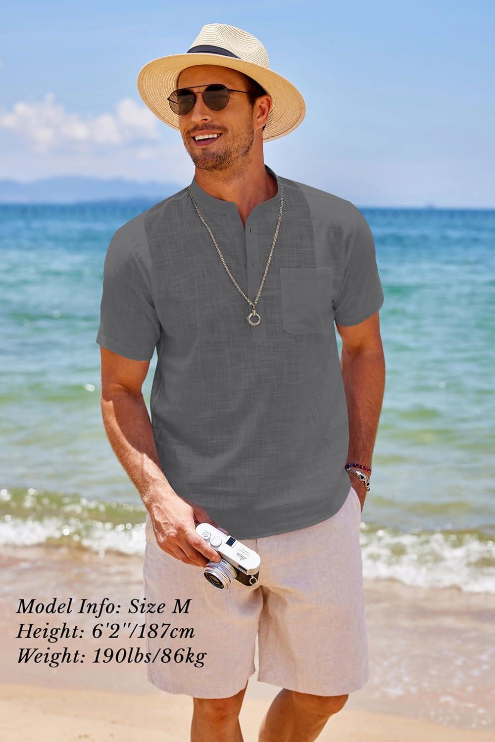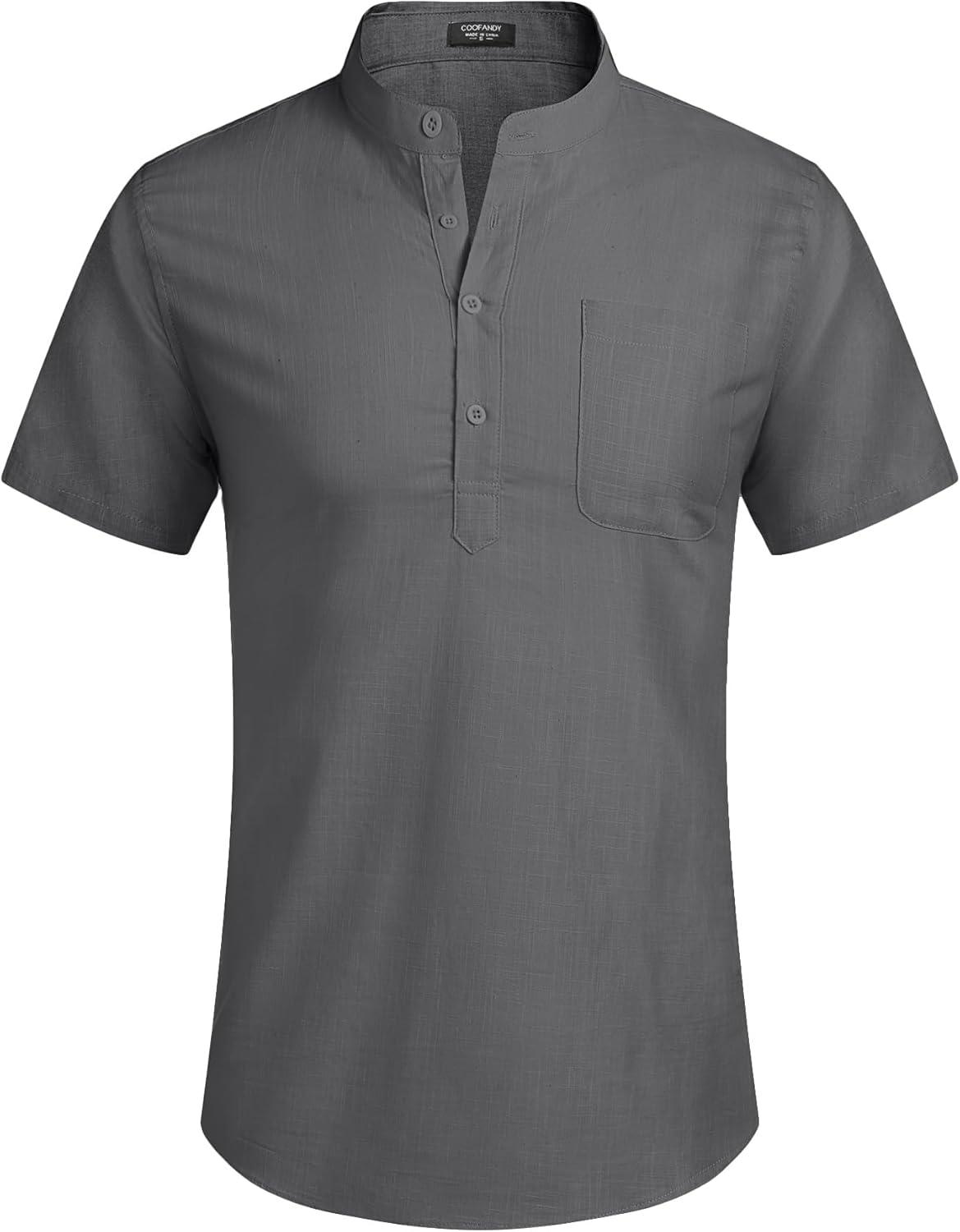 COOFANDY Men’s Cotton Linen Henley Shirt Short Sleeve Hippie Casual Beach T-Shirts with Pocket(Dark Grey)