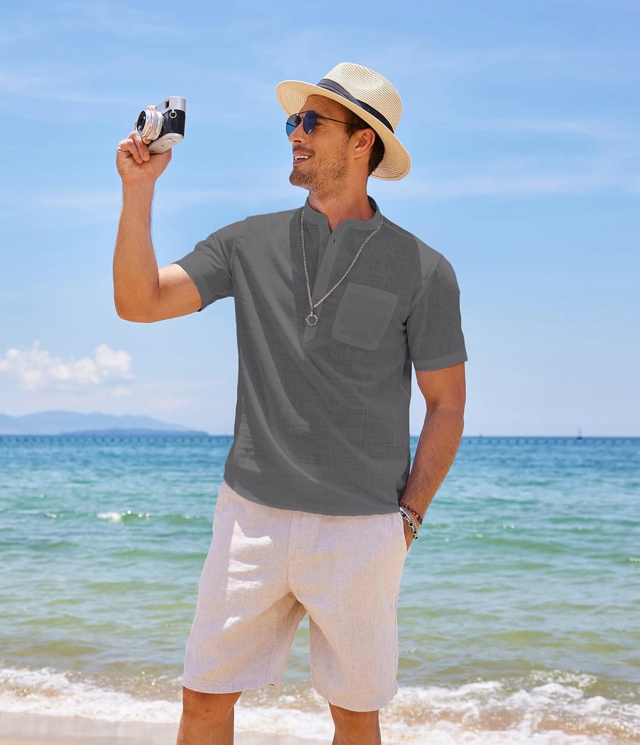 COOFANDY Men’s Cotton Linen Henley Shirt Short Sleeve Hippie Casual Beach T-Shirts with Pocket(Grey)