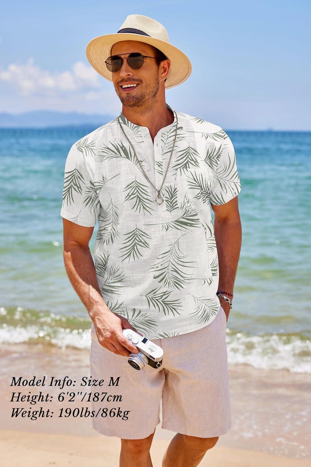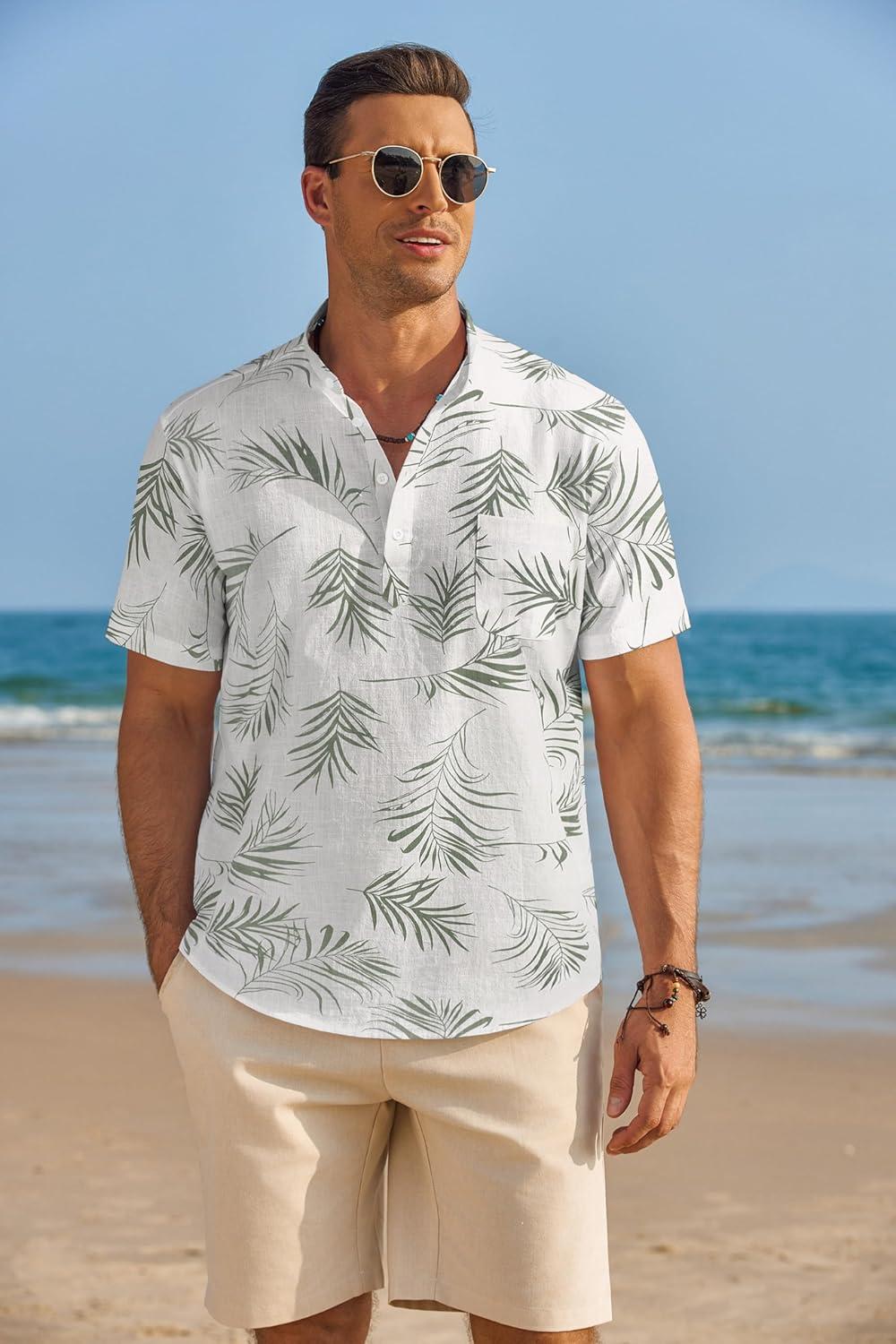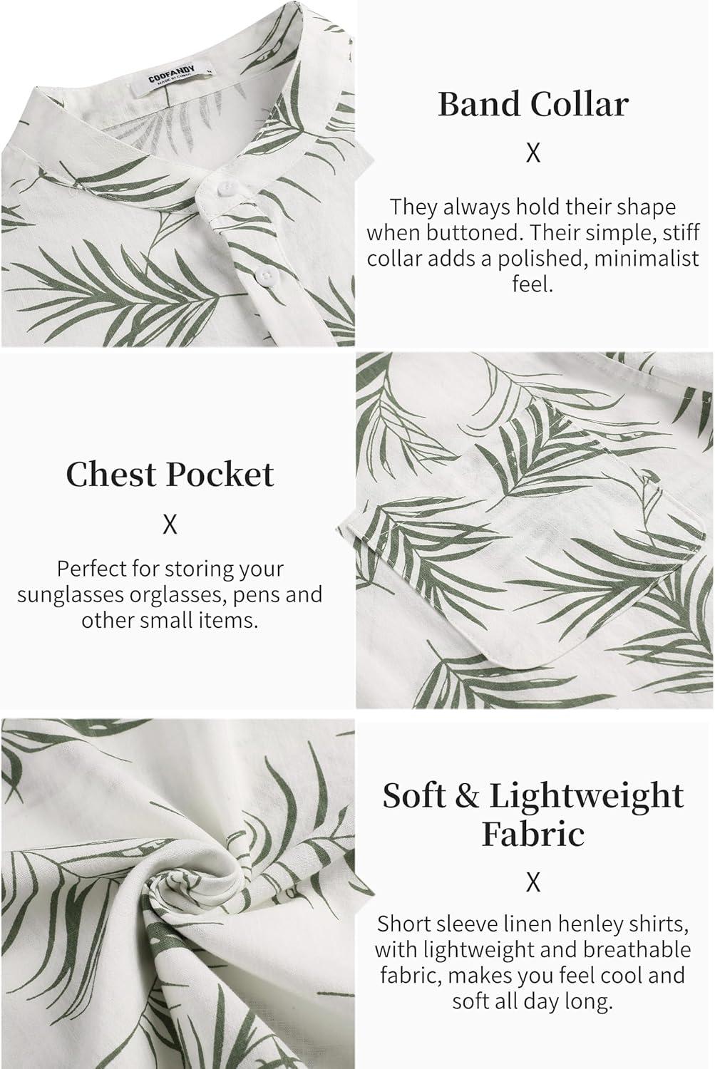 COOFANDY Men's Cotton Linen Henley Shirt Short Sleeve Hippie Casual Beach T-Shirts with Pocket(Green Leaf)