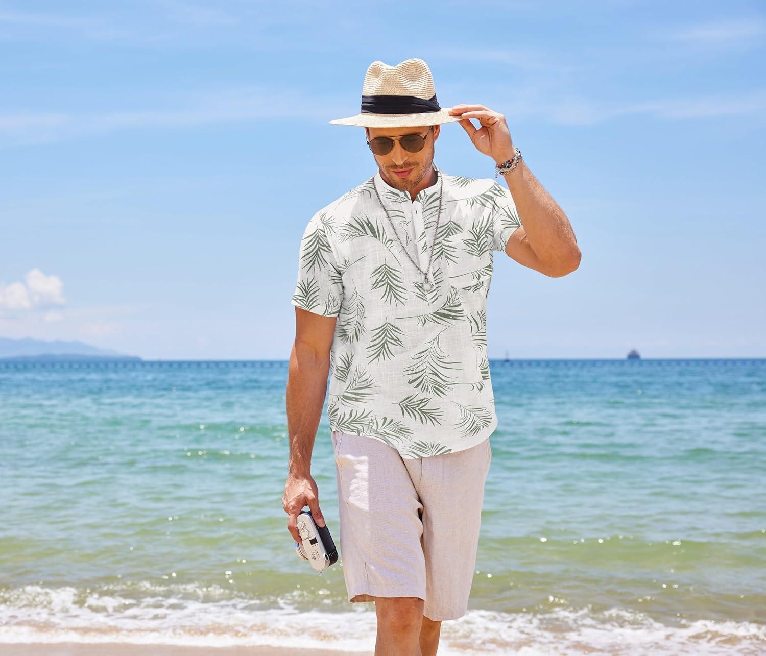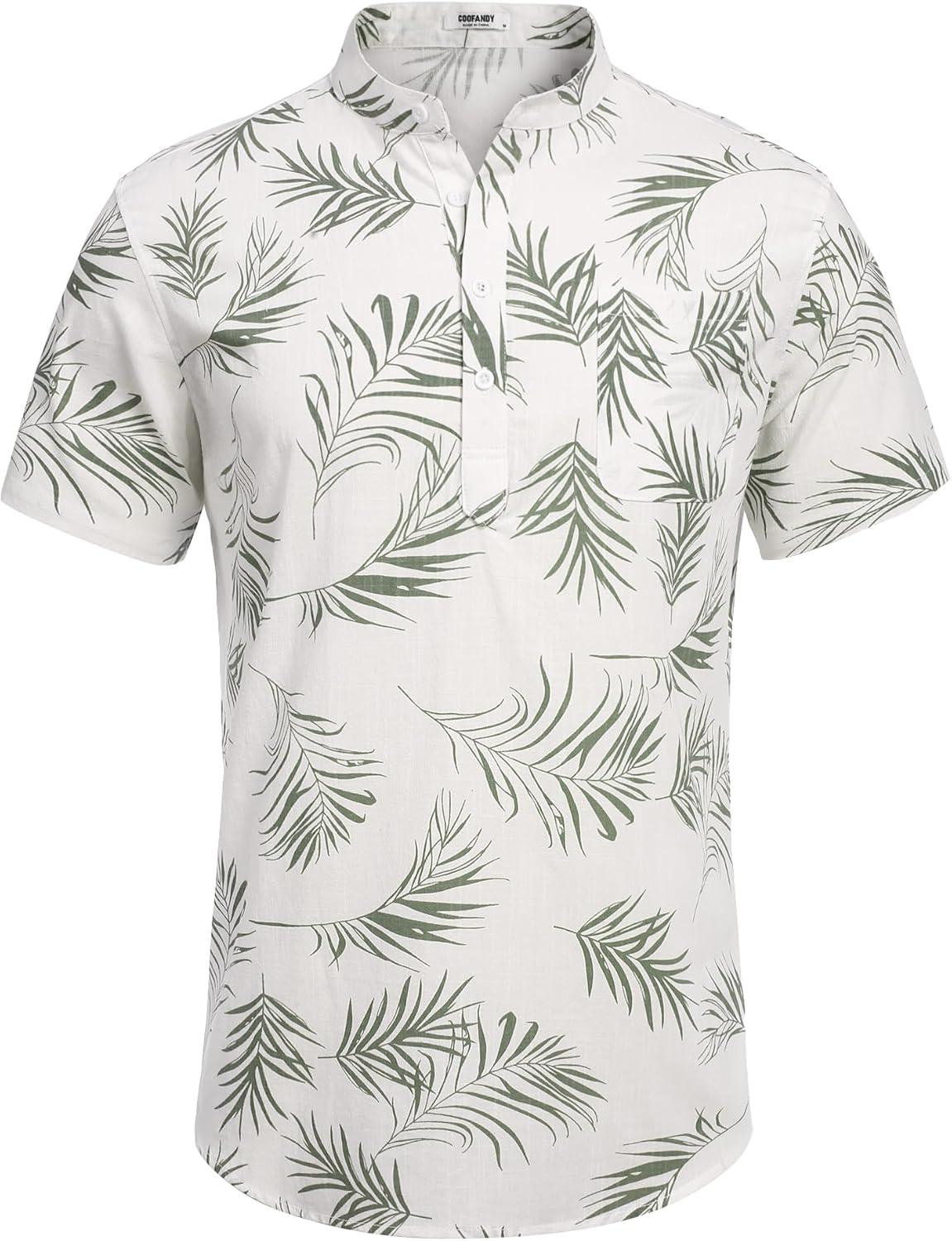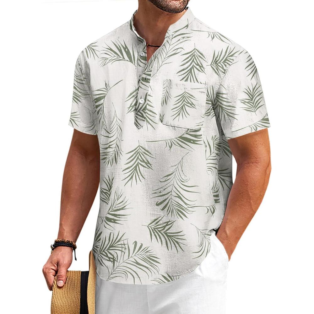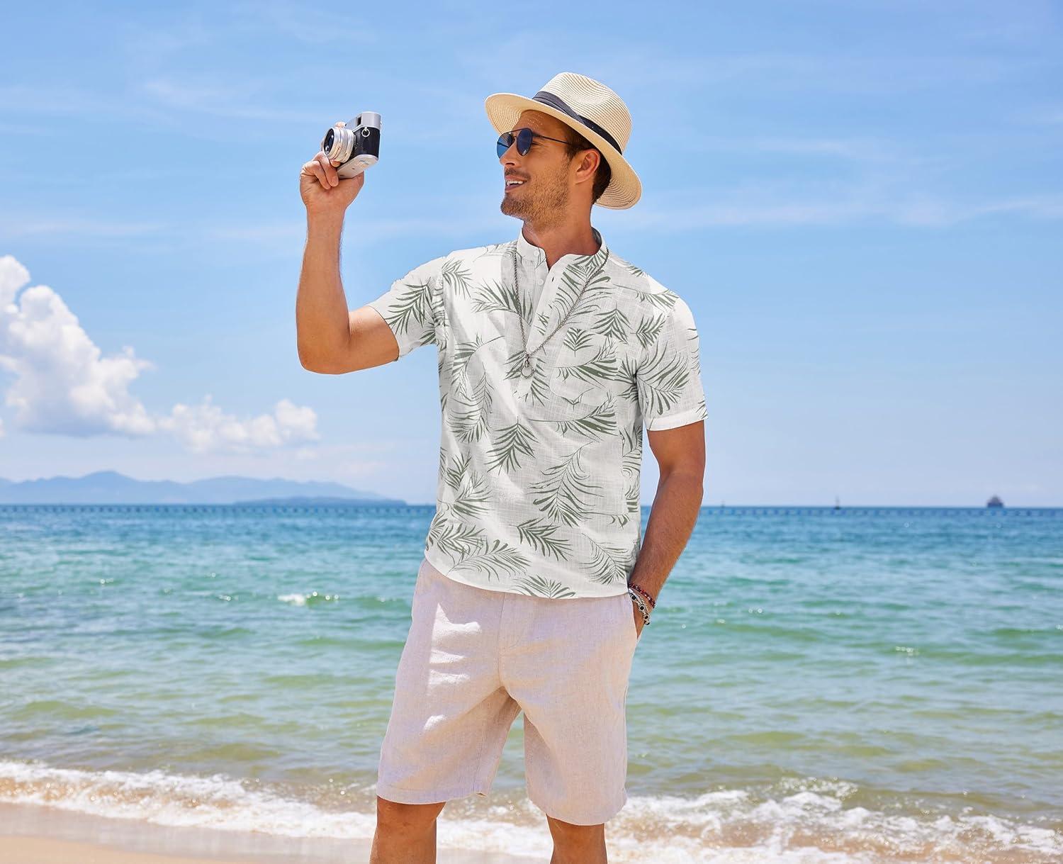 COOFANDY Men's Cotton Linen Henley Shirt Short Sleeve Hippie Casual Beach T-Shirts with Pocket(Green Leaf)
