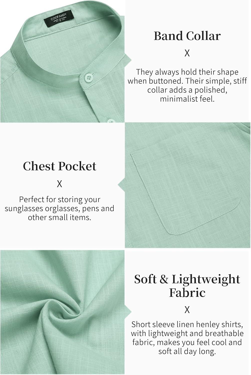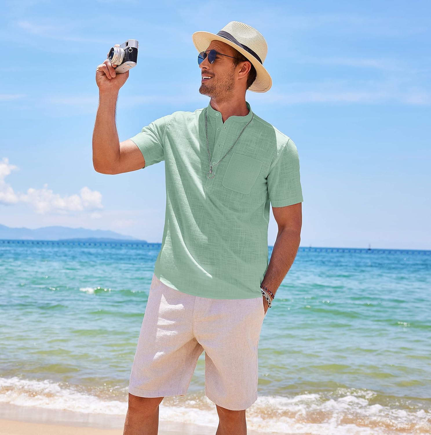 COOFANDY Men’s Cotton Linen Henley Shirt Short Sleeve Hippie Casual Beach T-Shirts with Pocket(Green Leaf)