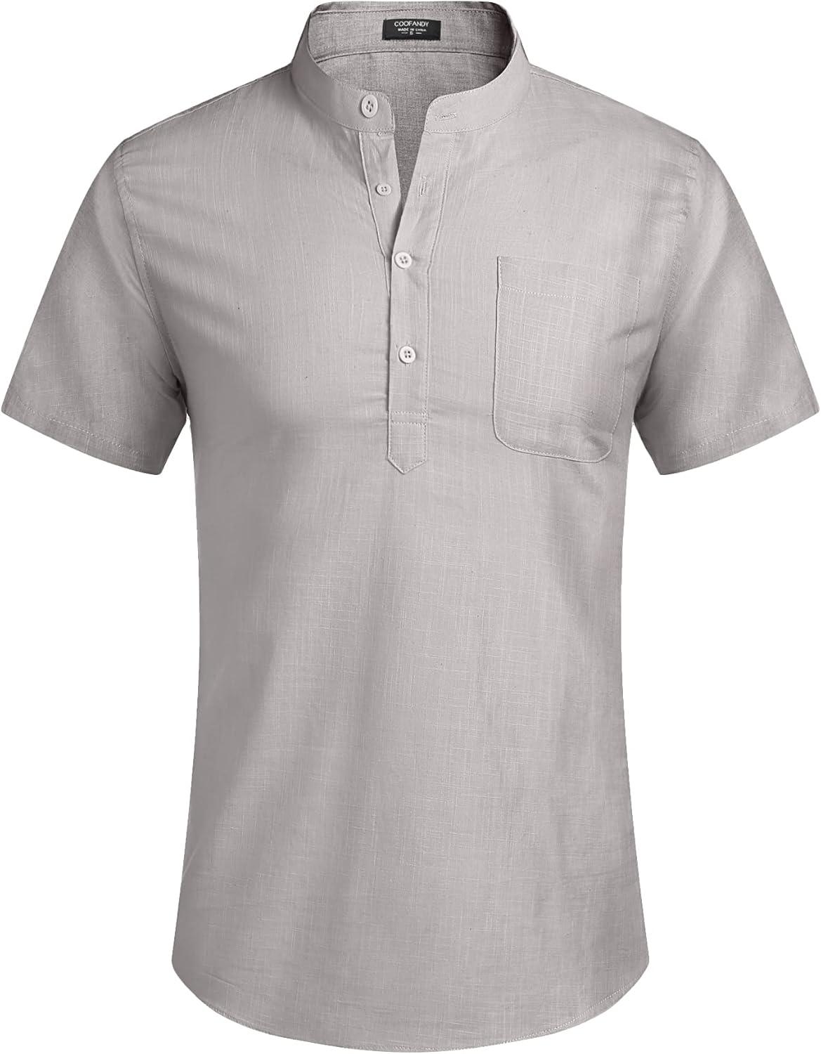 COOFANDY Men's Cotton Linen Henley Shirt Short Sleeve Hippie Casual Beach T-Shirts with Pocket(Grey)