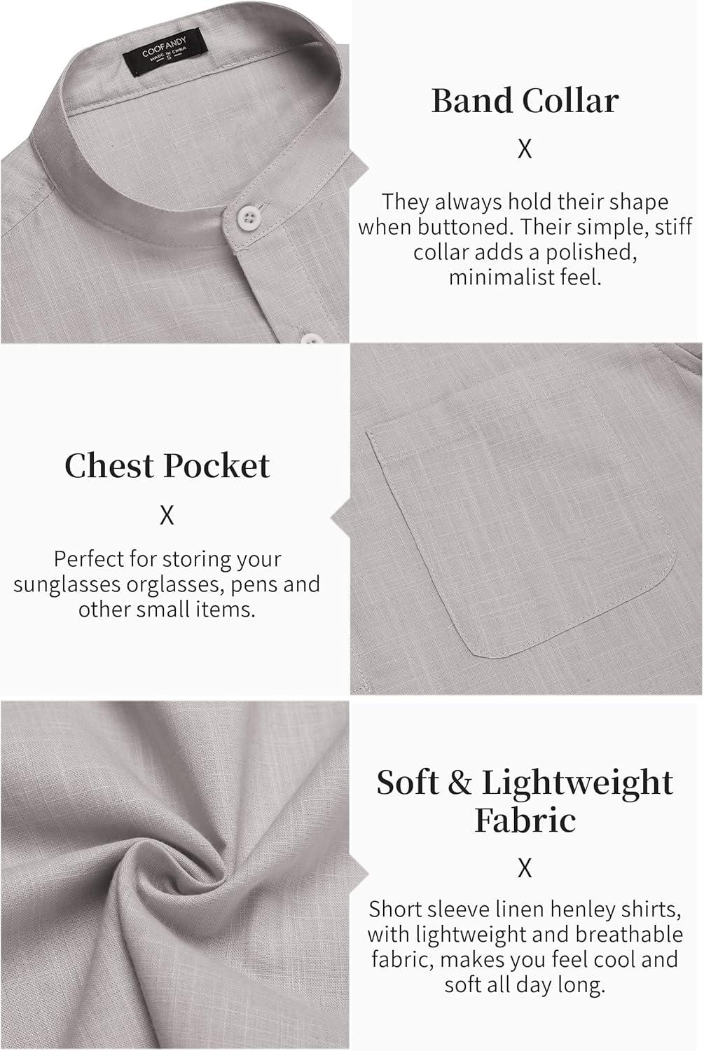 COOFANDY Men’s Cotton Linen Henley Shirt Short Sleeve Hippie Casual Beach T-Shirts with Pocket(Grey)