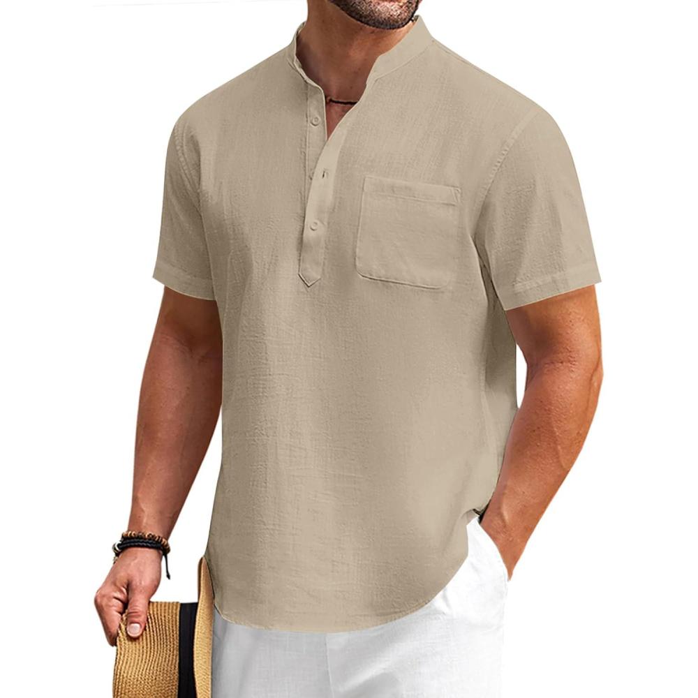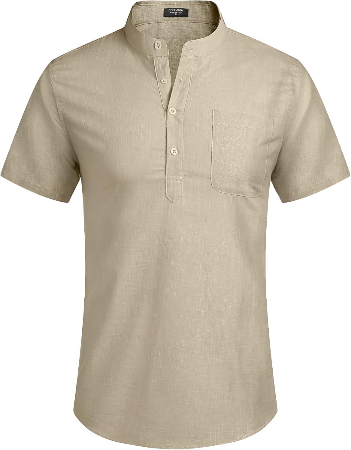 COOFANDY Men's Cotton Linen Henley Shirt Short Sleeve Hippie Casual Beach T-Shirts with Pocket(Khaki)