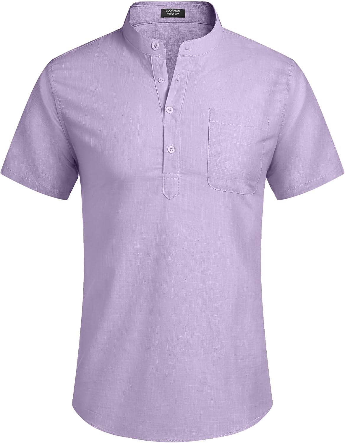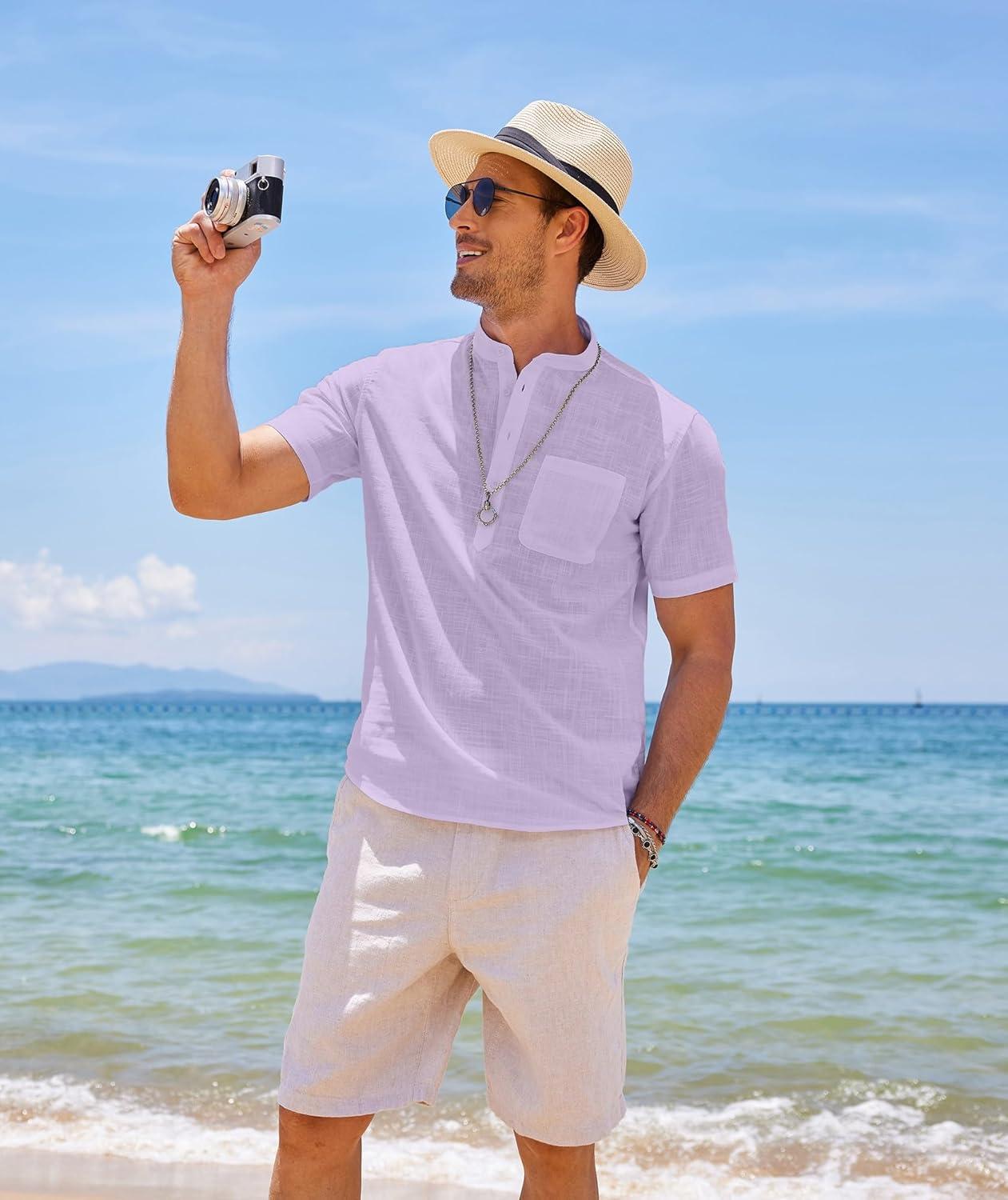 COOFANDY Men’s Cotton Linen Henley Shirt Short Sleeve Hippie Casual Beach T-Shirts with Pocket(Light Purple)