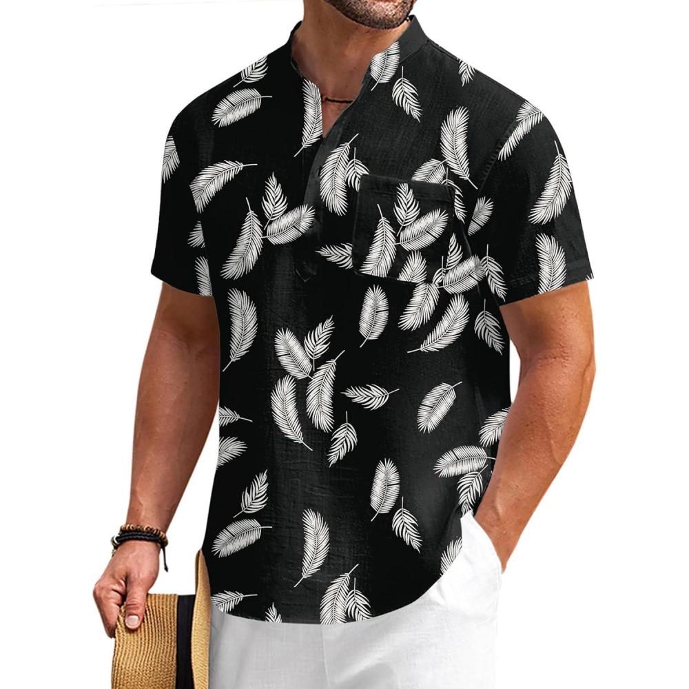 COOFANDY Men’s Cotton Linen Henley Shirt Short Sleeve Hippie Casual Beach T-Shirts with Pocket(White Leaf)