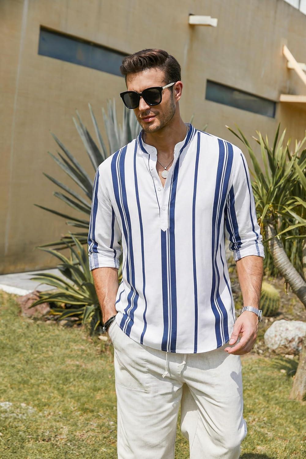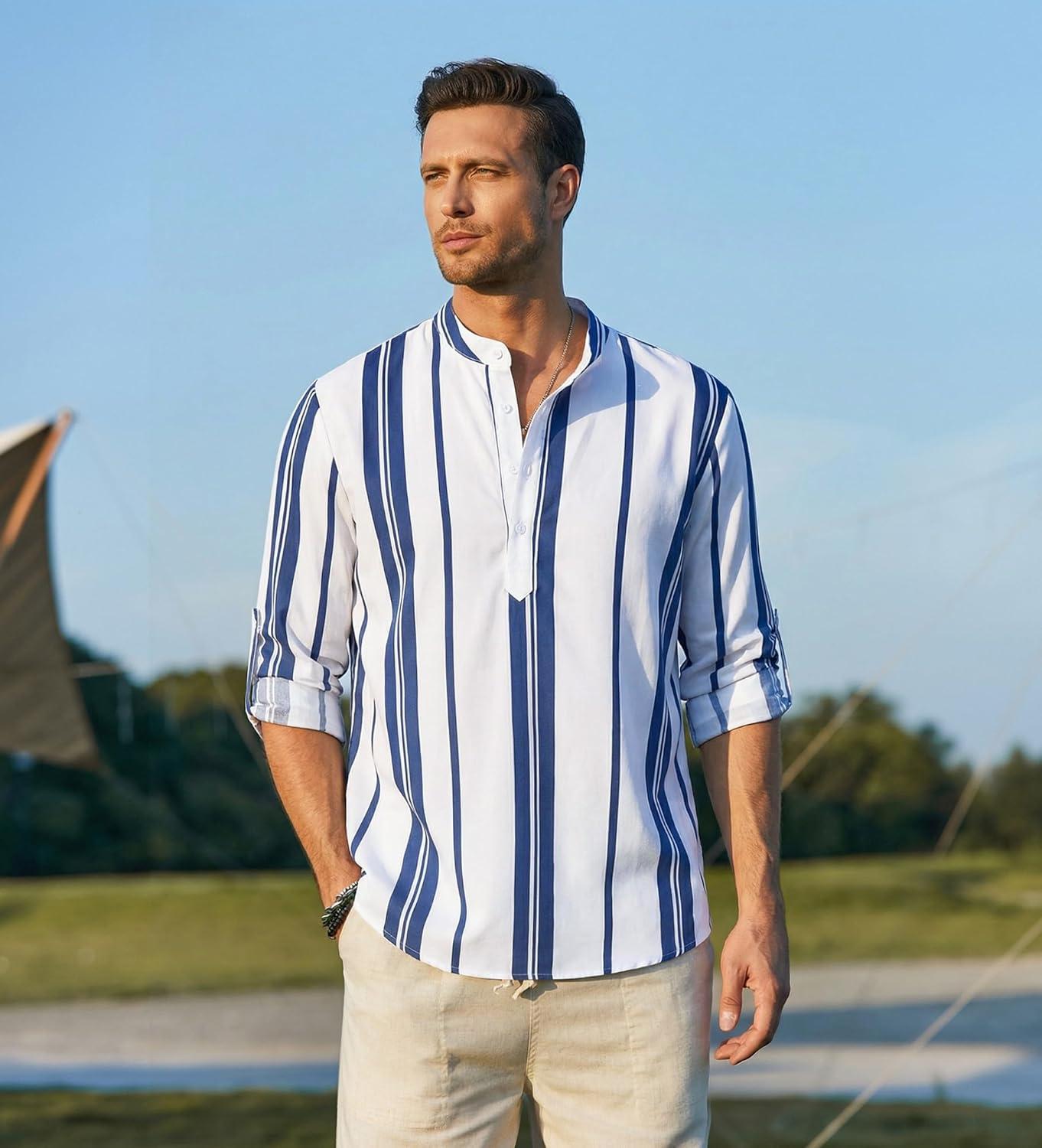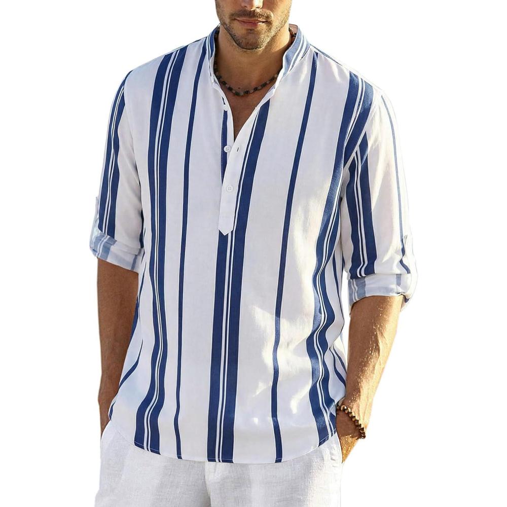 COOFANDY Men’s Cotton Linen Henley T-Shirt Long Sleeve Hippie Casual Beach T-Shirts(Dark Blue Stripes)
