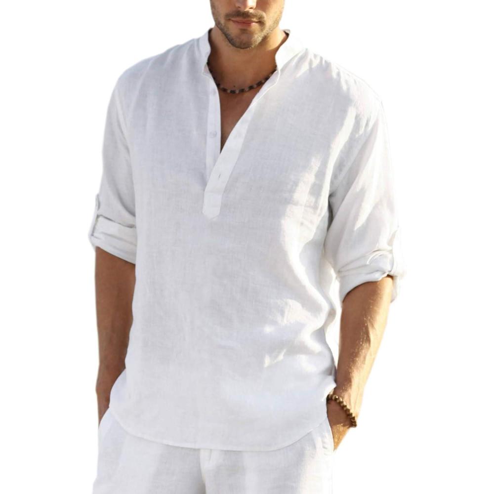 COOFANDY Men’s Cotton Linen Henley T-Shirts Long Sleeve Hippie Casual Beach T-Shirts(01-white)