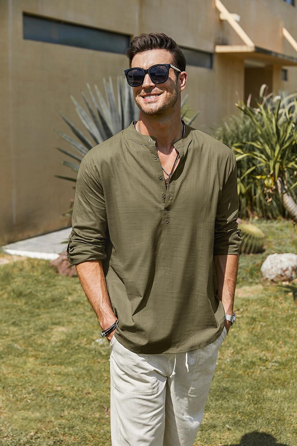 COOFANDY Men’s Cotton Linen Henley T-Shirts Long Sleeve Hippie Casual Beach T-Shirts(Army Green)