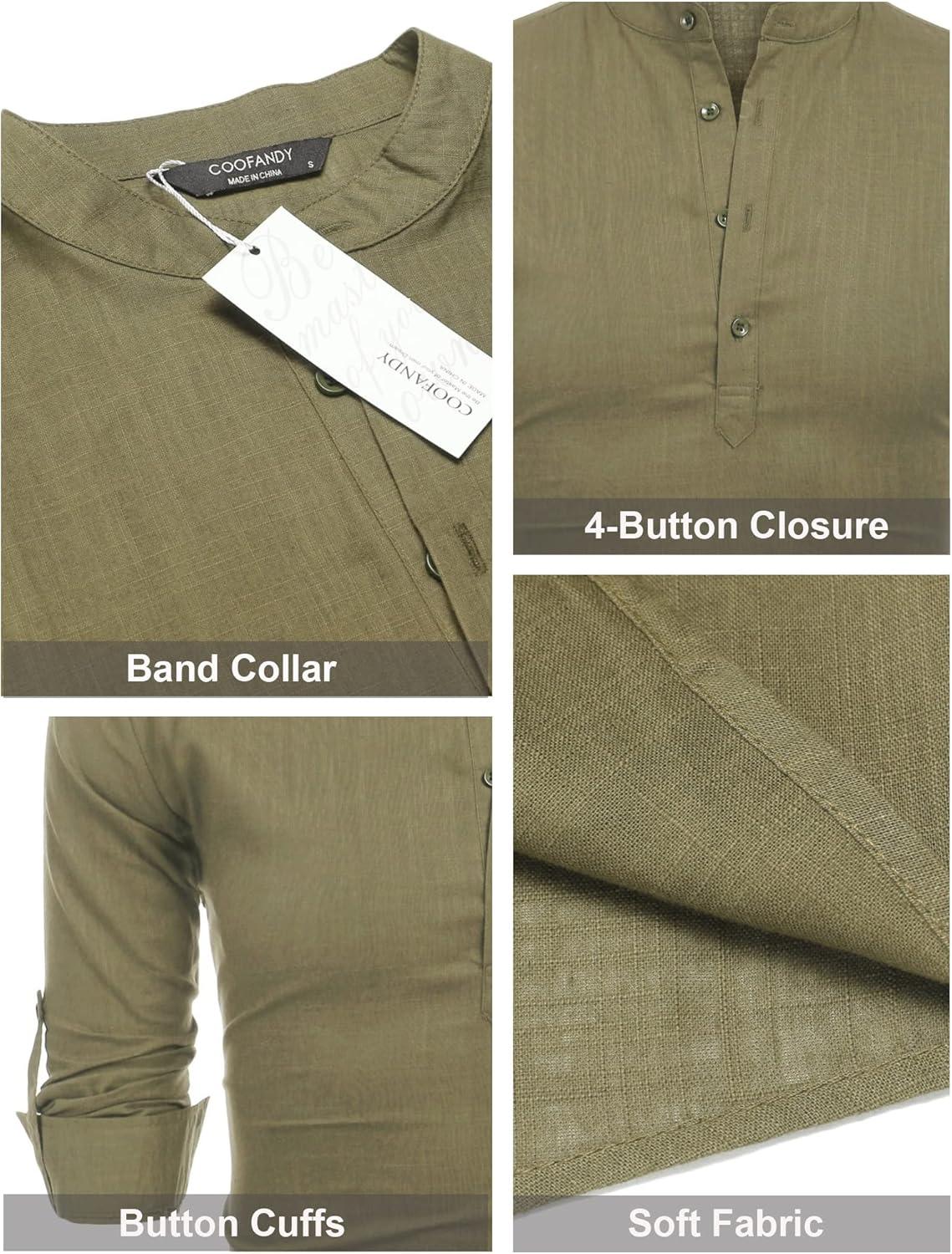 COOFANDY Men's Cotton Linen Henley T-Shirts Long Sleeve Hippie Casual Beach T-Shirts(Army Green)