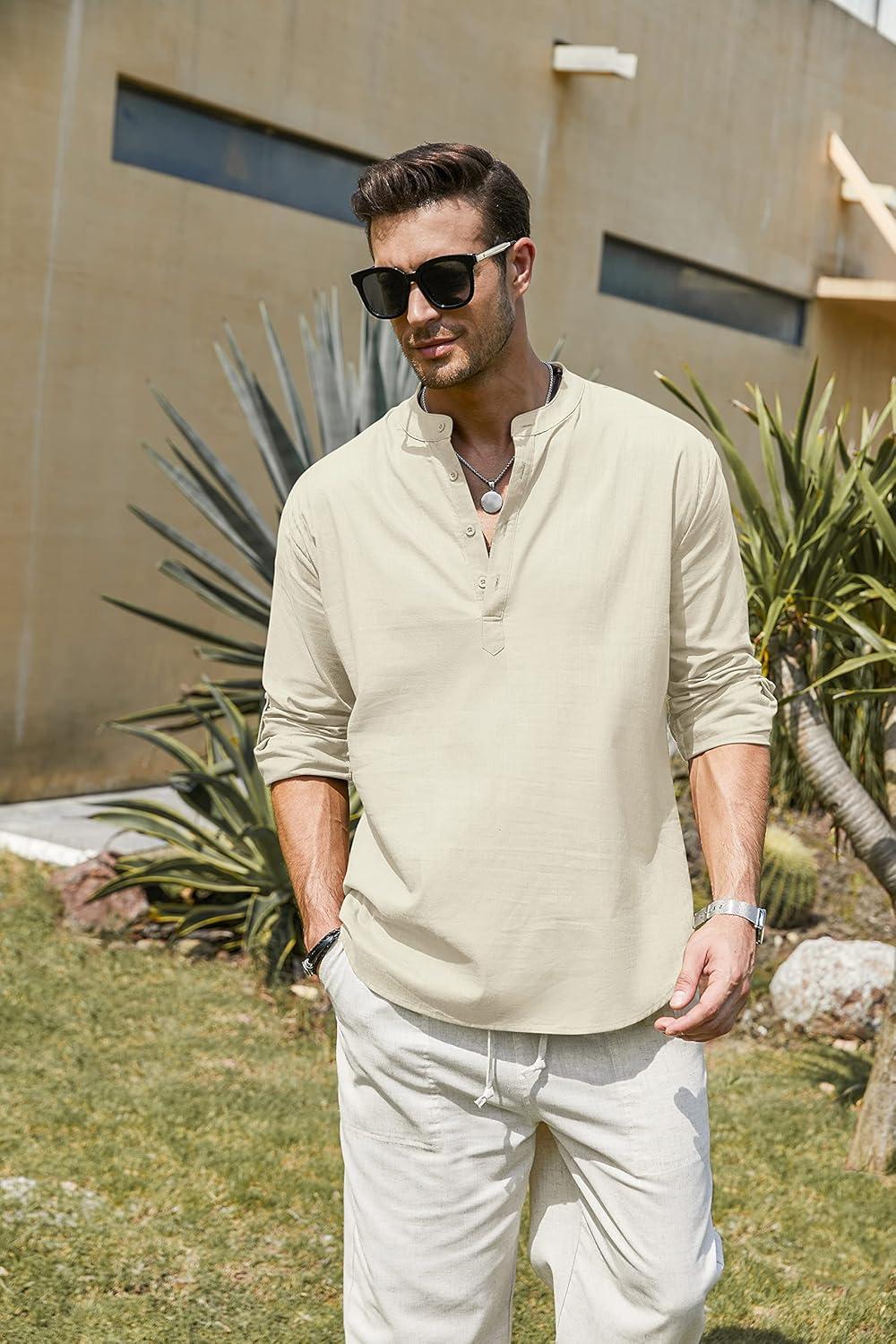 COOFANDY Men’s Cotton Linen Henley T-Shirts Long Sleeve Hippie Casual Beach T-Shirts(Beige)