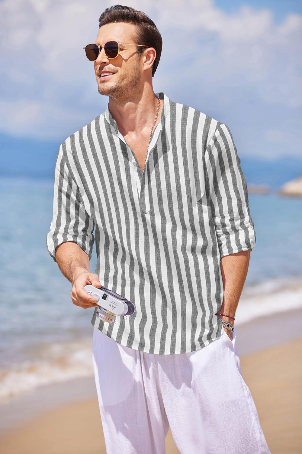 COOFANDY Men’s Cotton Linen Henley T-Shirts Long Sleeve Hippie Casual Beach T-Shirts(Grey Blue Striped)