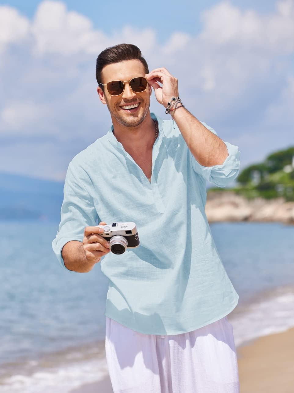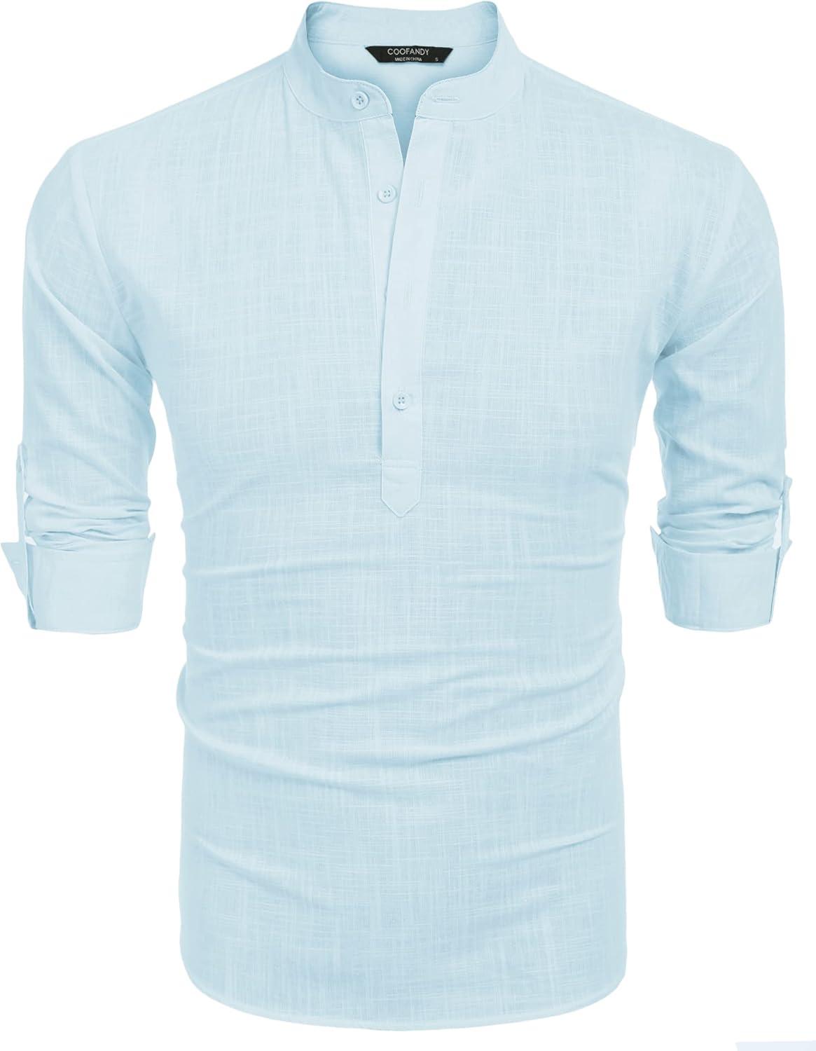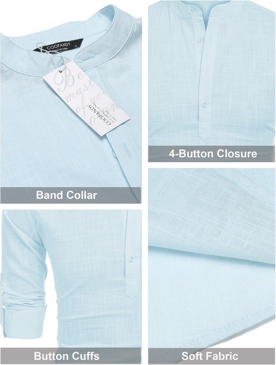 COOFANDY Men’s Cotton Linen Henley T-Shirts Long Sleeve Hippie Casual Beach T-Shirts(Blue)