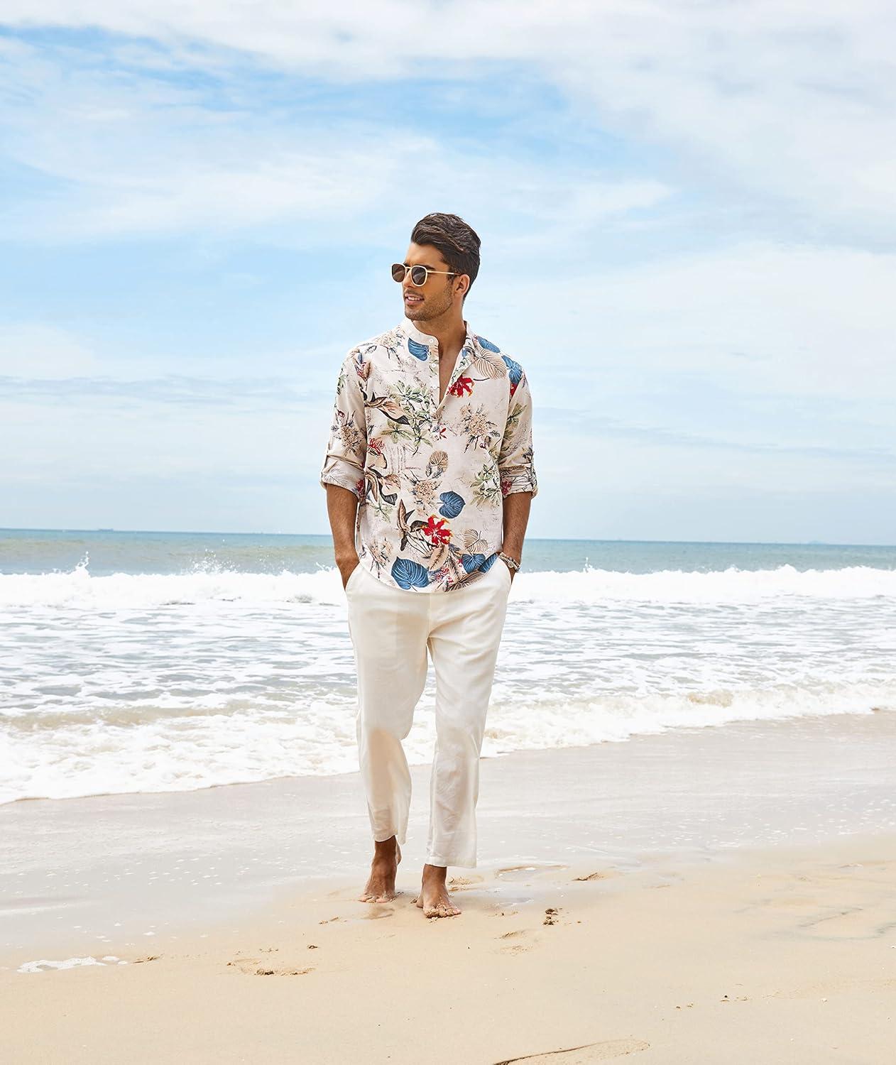 COOFANDY Men’s Cotton Linen Henley T-Shirts Long Sleeve Hippie Casual Beach T-Shirts(White – Palm Tree)