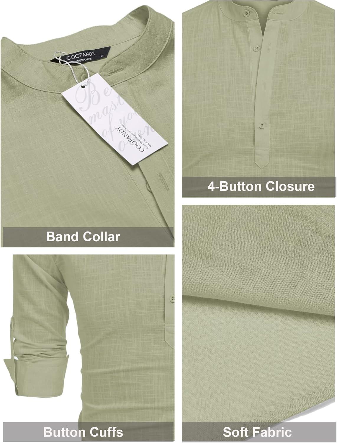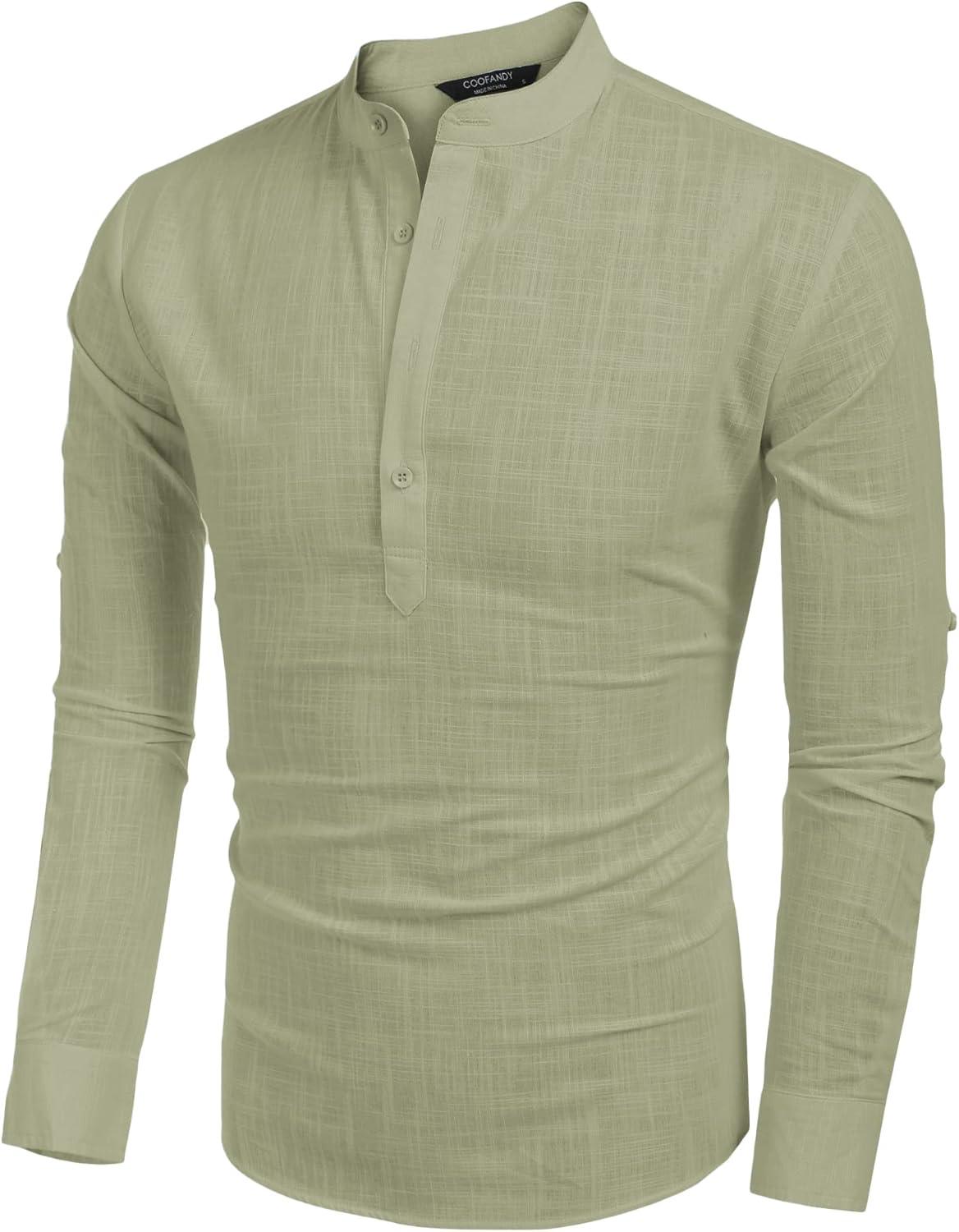 COOFANDY Men's Cotton Linen Henley T-Shirts Long Sleeve Hippie Casual Beach T-Shirts(Light Green)