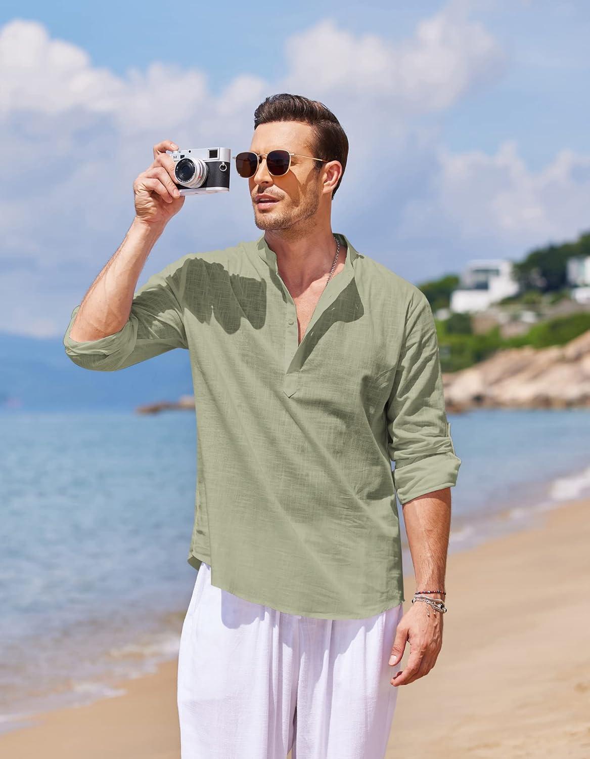 COOFANDY Men’s Cotton Linen Henley T-Shirts Long Sleeve Hippie Casual Beach T-Shirts(Light Green)