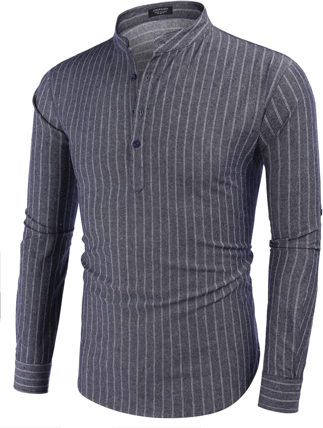 COOFANDY Men's Cotton Linen Henley T-Shirts Long Sleeve Hippie Casual Beach T-Shirts(Navy Striped)
