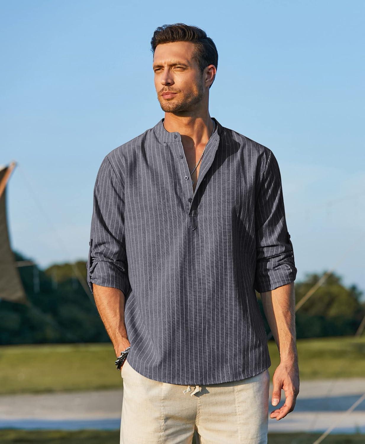 COOFANDY Men’s Cotton Linen Henley T-Shirts Long Sleeve Hippie Casual Beach T-Shirts(Navy Striped)
