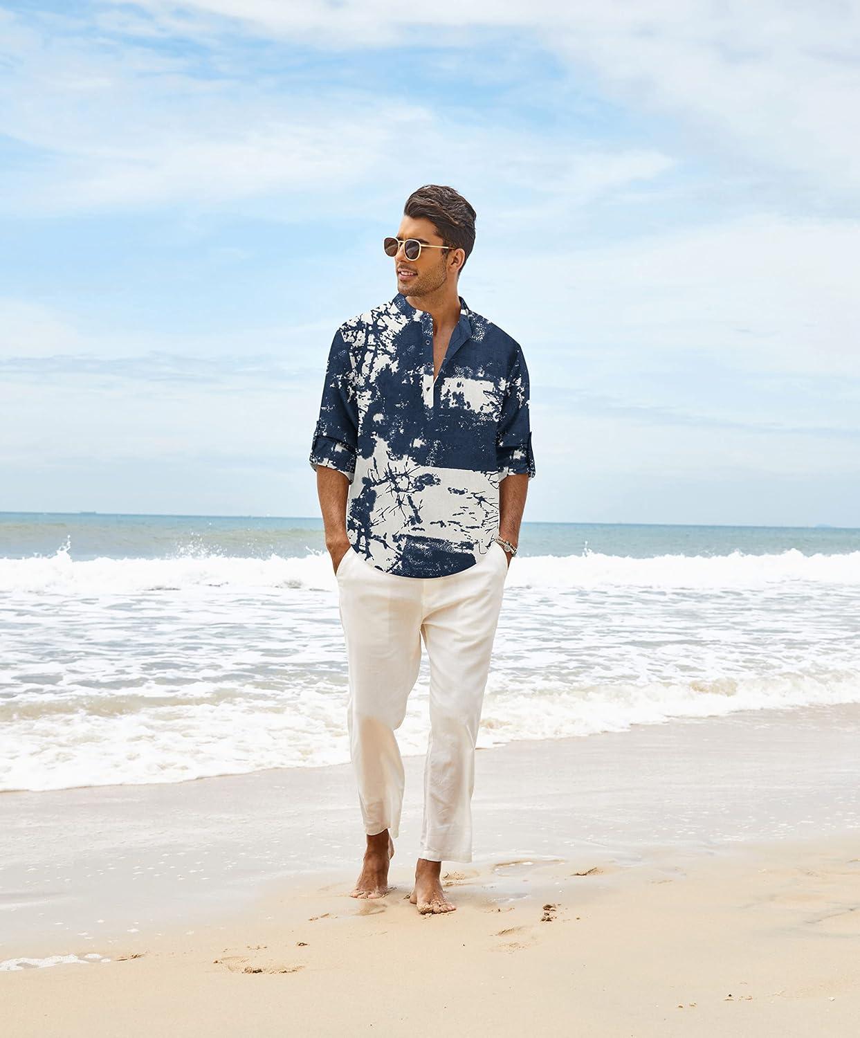 COOFANDY Men’s Cotton Linen Henley T-Shirts Long Sleeve Hippie Casual Beach T-Shirts(Navy Tie-dye)