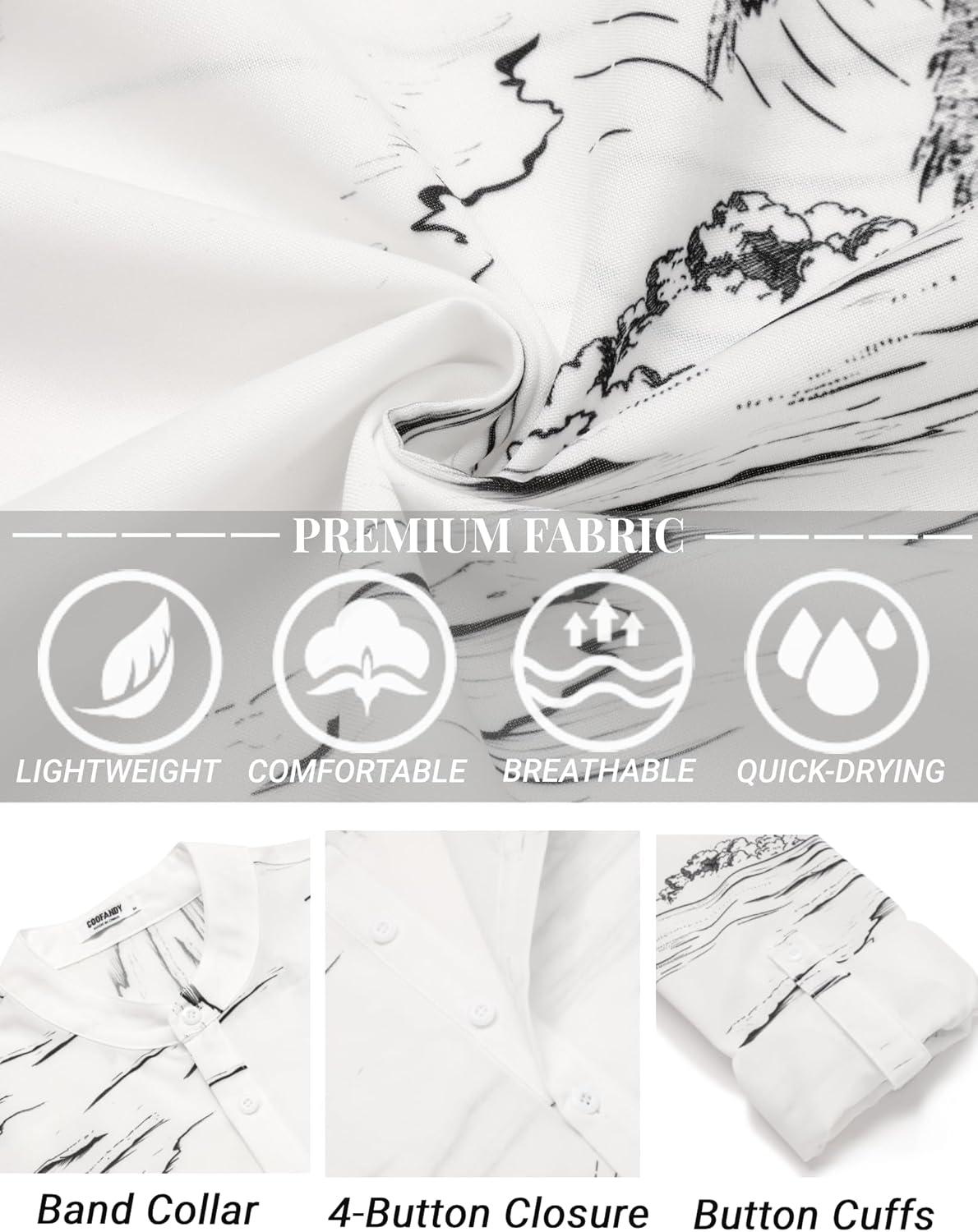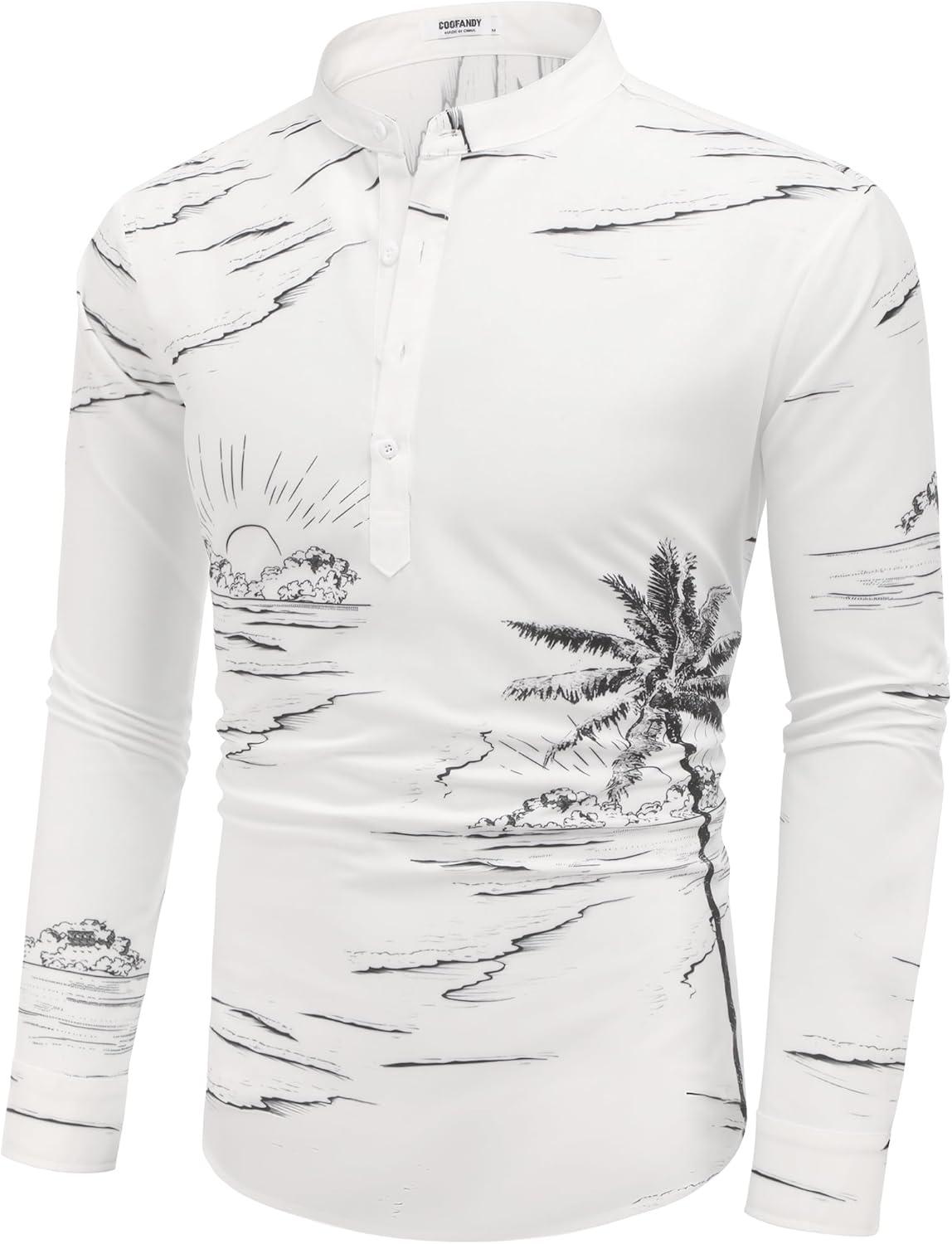 COOFANDY Men’s Cotton Linen Henley T-Shirts Long Sleeve Hippie Casual Beach T-Shirts(White – Palm Tree)