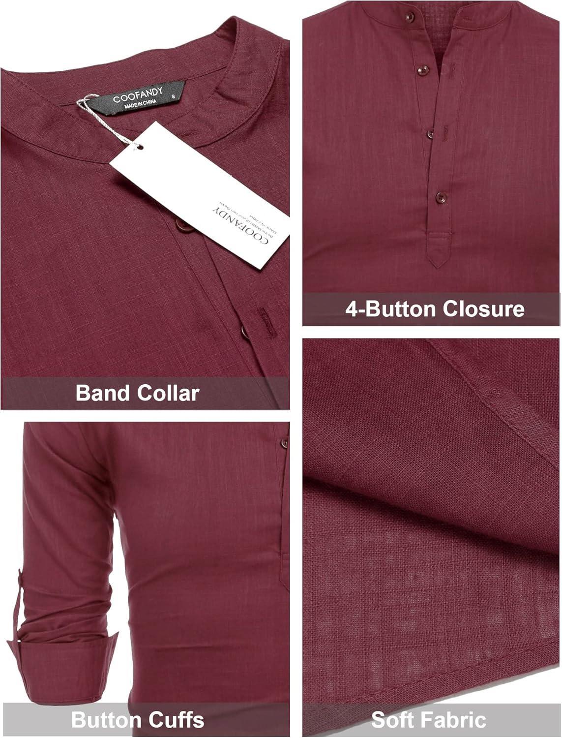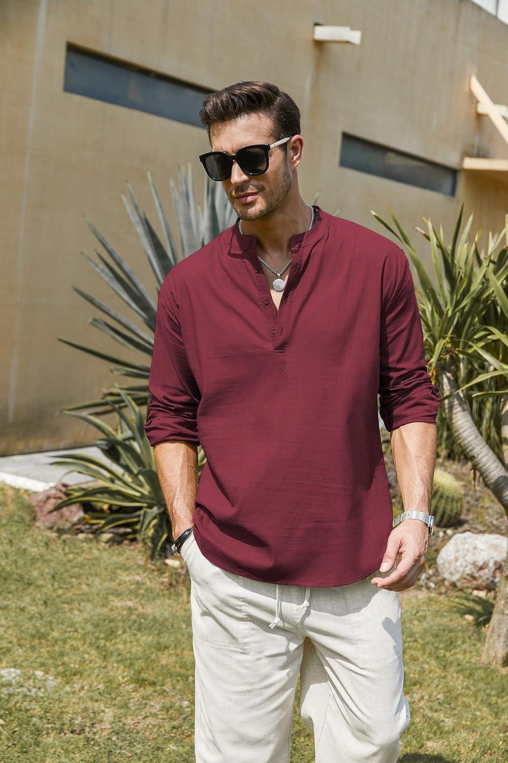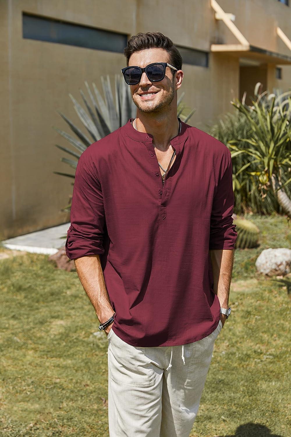 COOFANDY Men’s Cotton Linen Henley T-Shirts Long Sleeve Hippie Casual Beach T-Shirts(Wine Red)