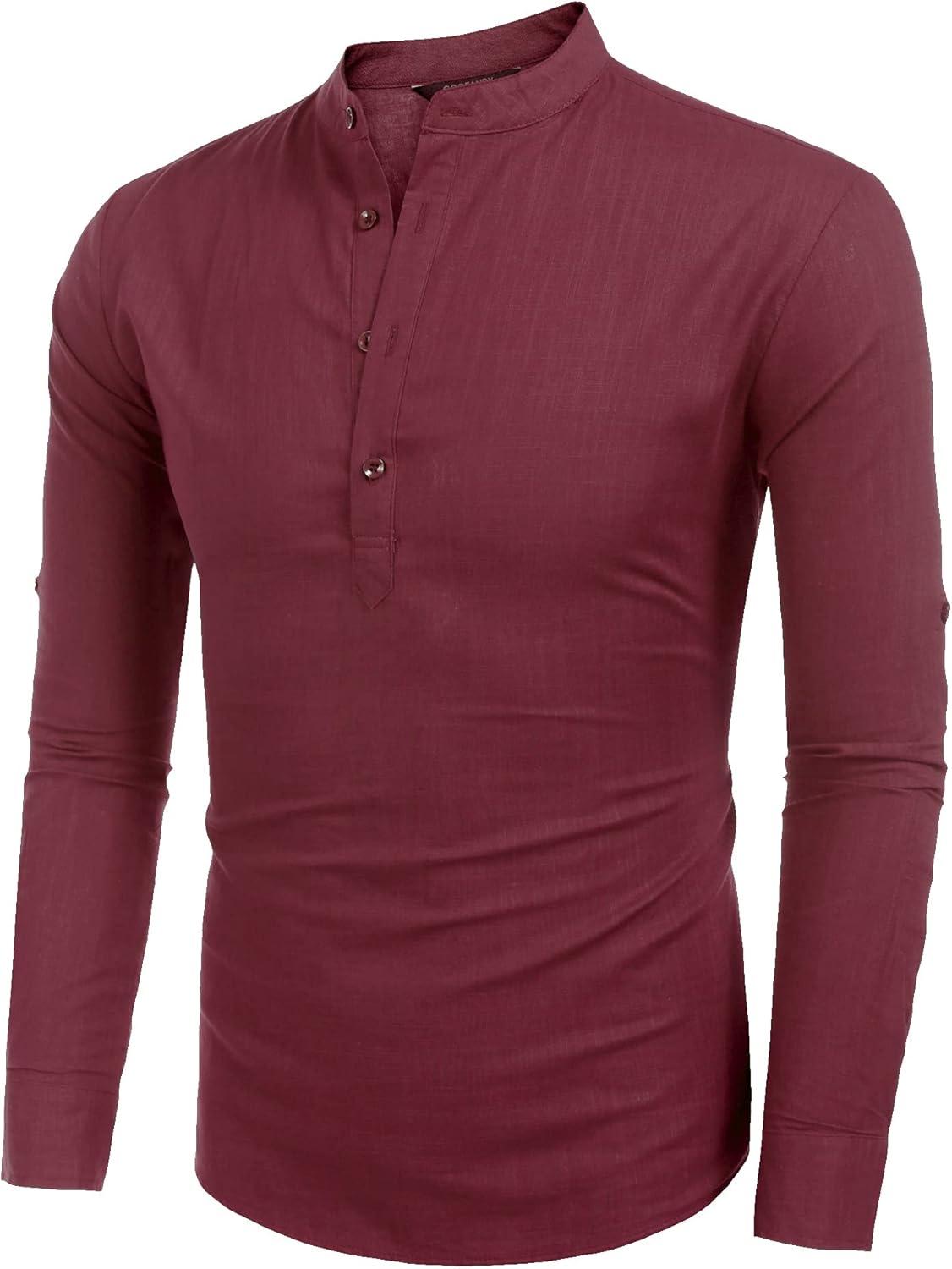 COOFANDY Men's Cotton Linen Henley T-Shirts Long Sleeve Hippie Casual Beach T-Shirts(Wine Red)