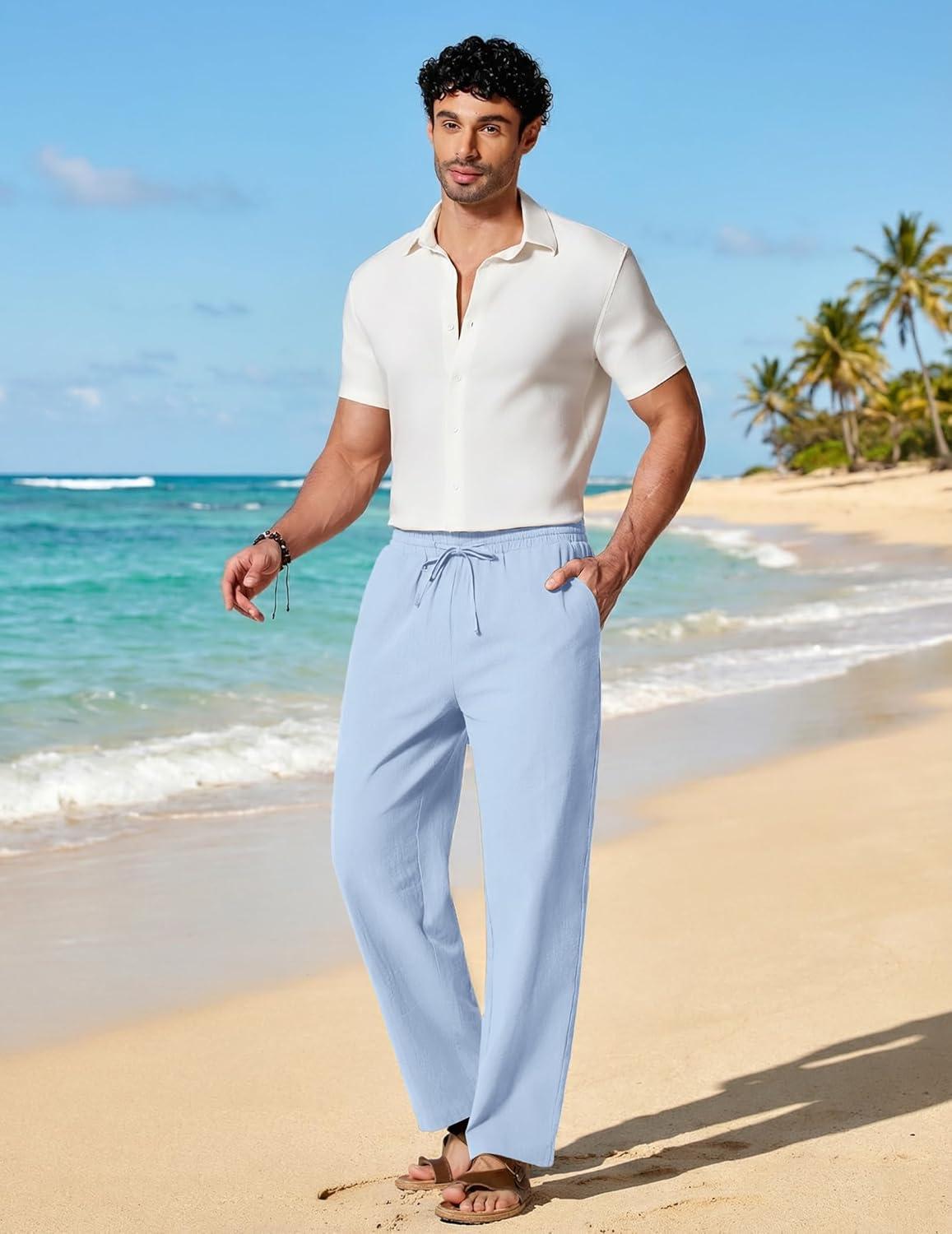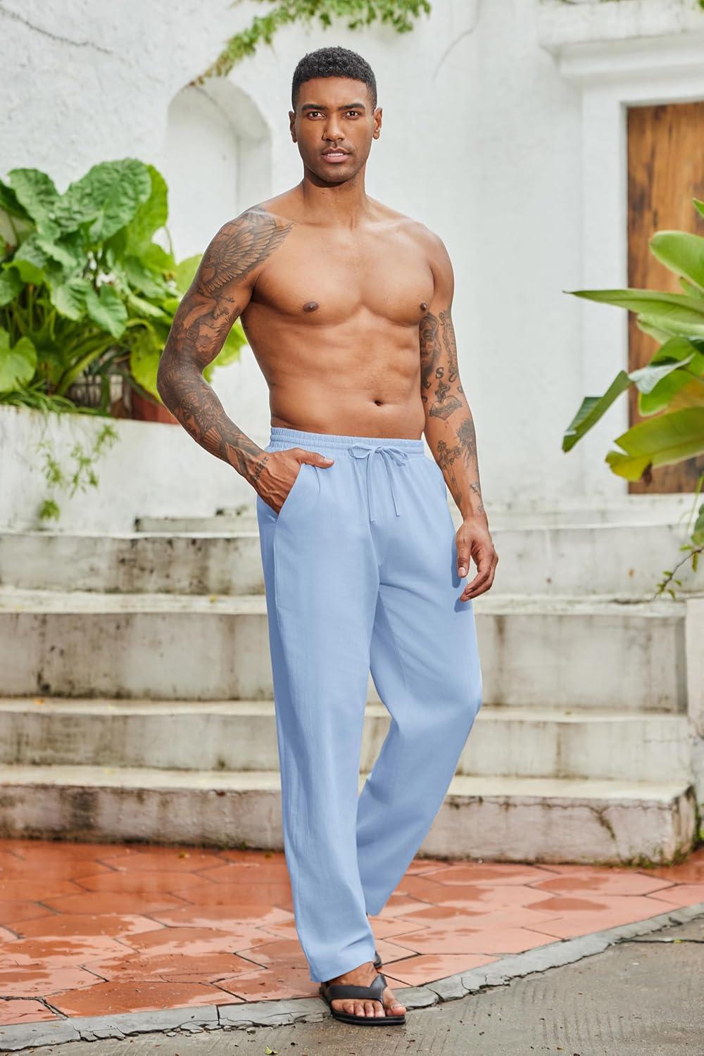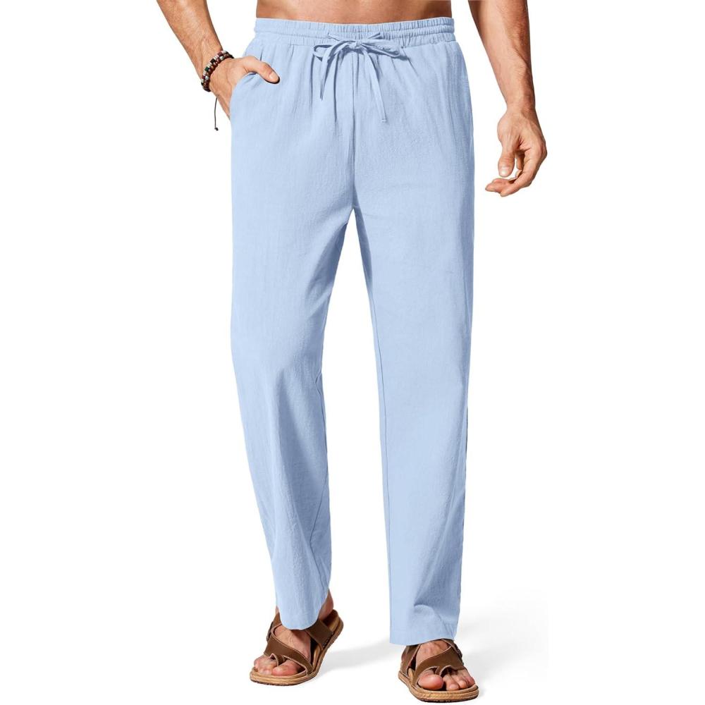 COOFANDY Men’s Cotton Linen Pants Lightweight Casual Linen Dress Pants Drawstring Summer Beach Trousers(Light Blue)