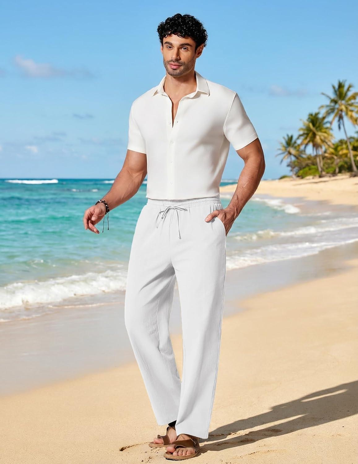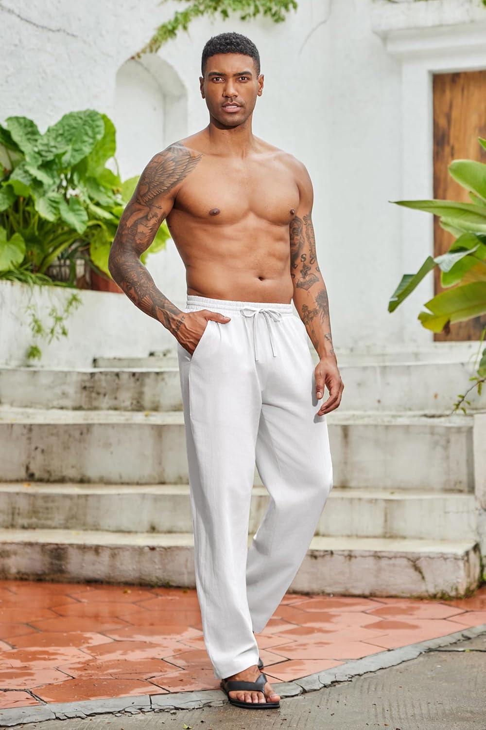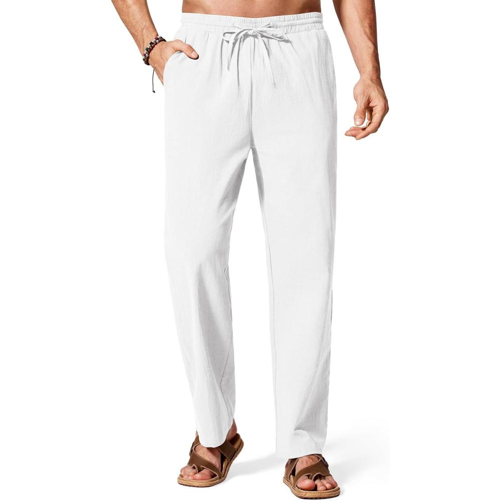 COOFANDY Men’s Cotton Linen Pants Lightweight Casual Linen Dress Pants Drawstring Summer Beach Trousers(White)