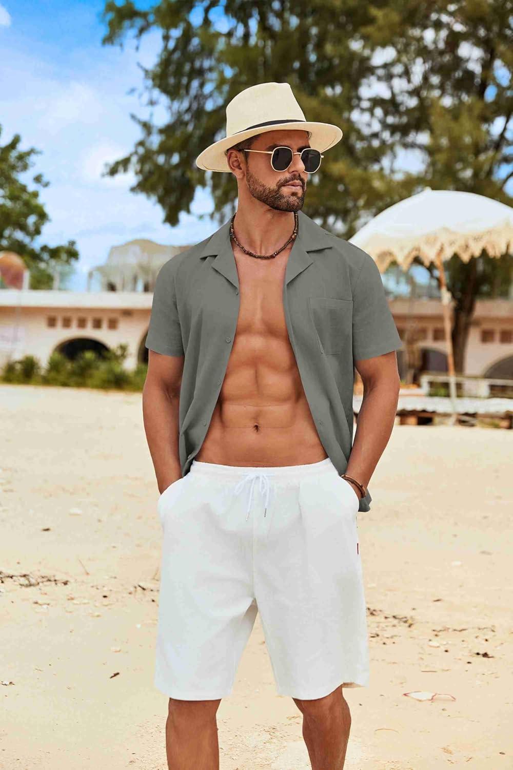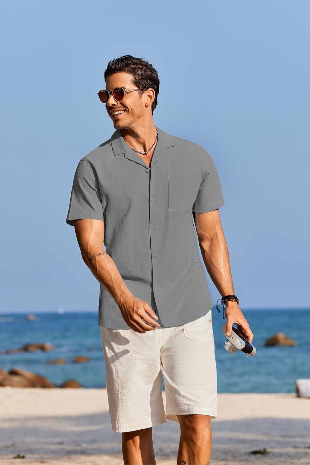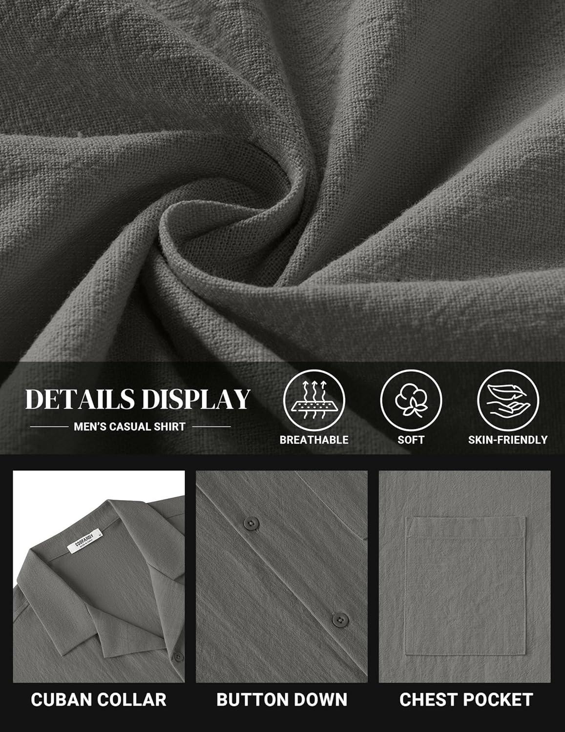 COOFANDY Mens Cotton Linen Shirt Casual Button Down Short Sleeve Shirts Summer Cuban Vacation Beach Shirts with Pocket(Dark Grey)