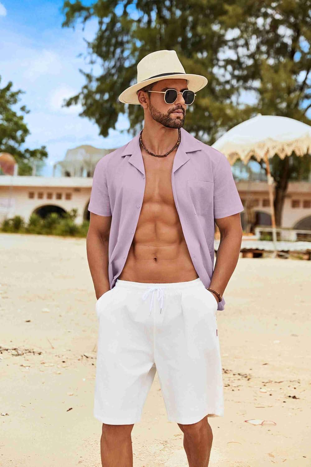 imageCOOFANDY Mens Cotton Linen Shirt Casual Button Down Short Sleeve Shirts Summer Cuban Vacation Beach Shirts with PocketLight Purple