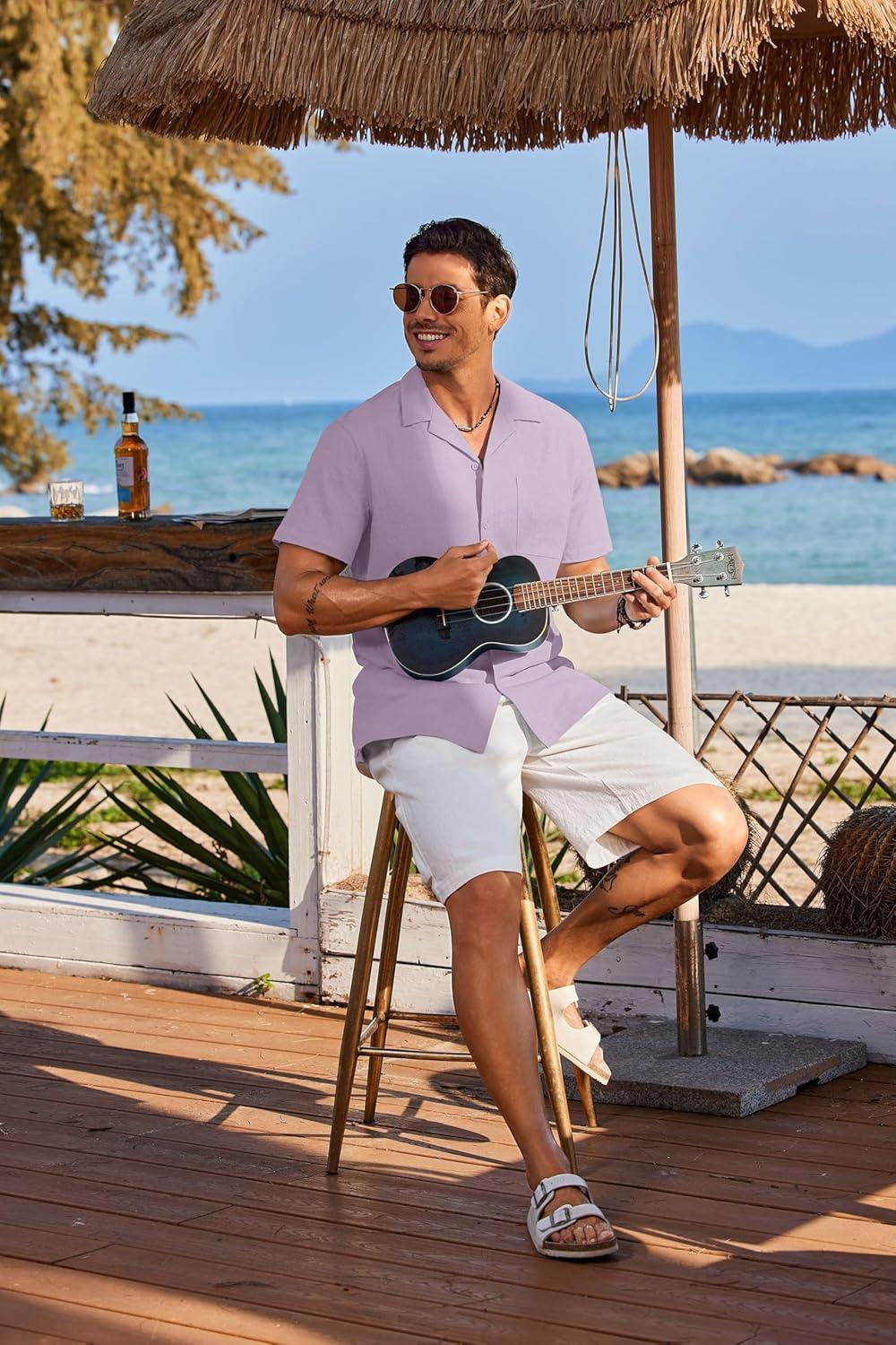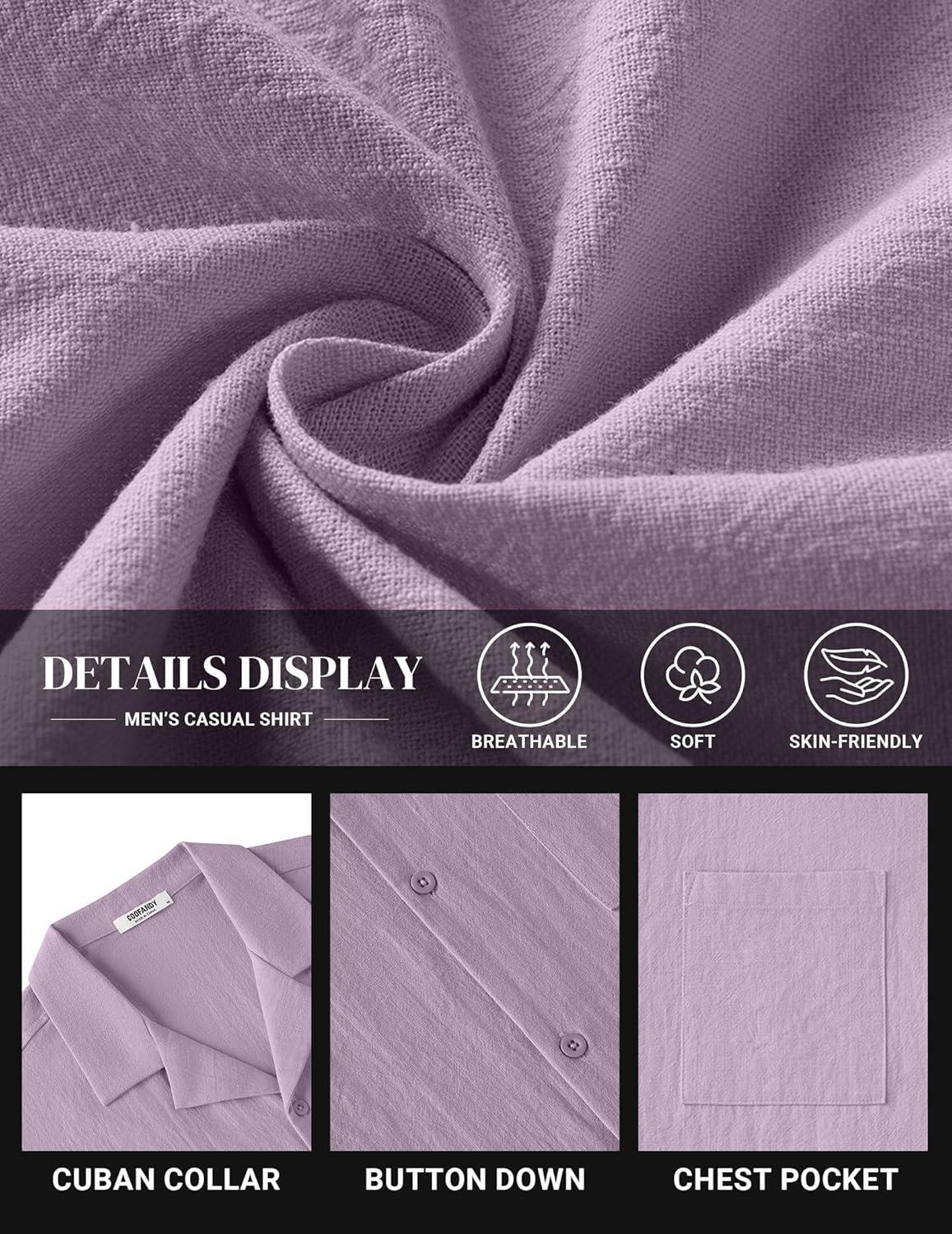 COOFANDY Mens Cotton Linen Shirt Casual Button Down Short Sleeve Shirts Summer Cuban Vacation Beach Shirts with Pocket(Light Purple)