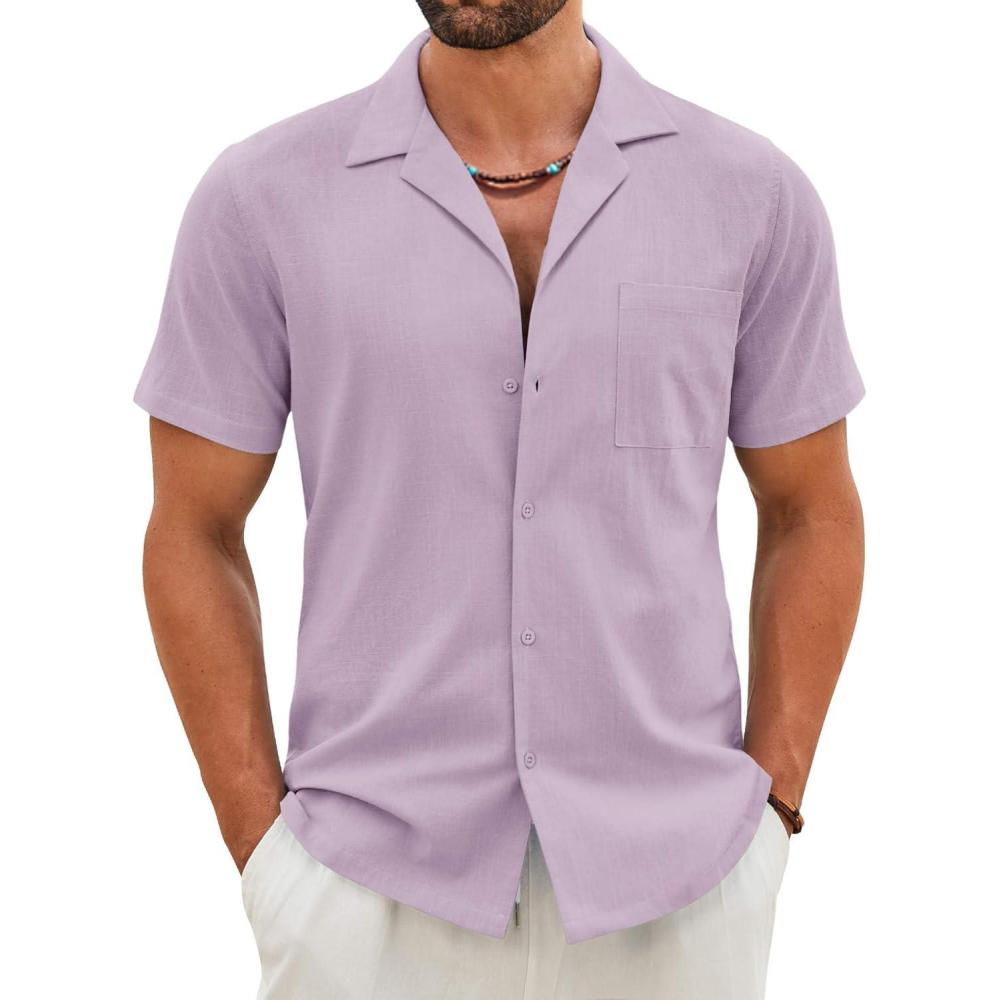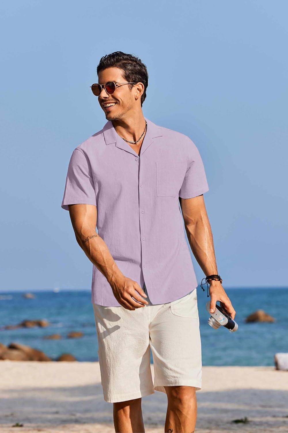 Get the COOFANDY Mens Cotton Linen Shirt Casual Button Down Short Sleeve Shirts Summer Cuban Vacation Beach Shirts with Pocket(Light Purple) you want at a price you can afford with our markdown sale.