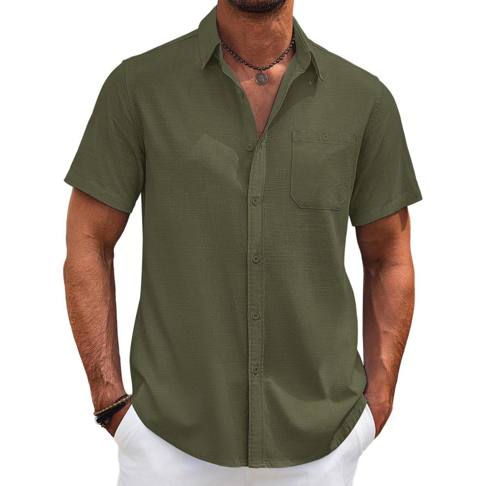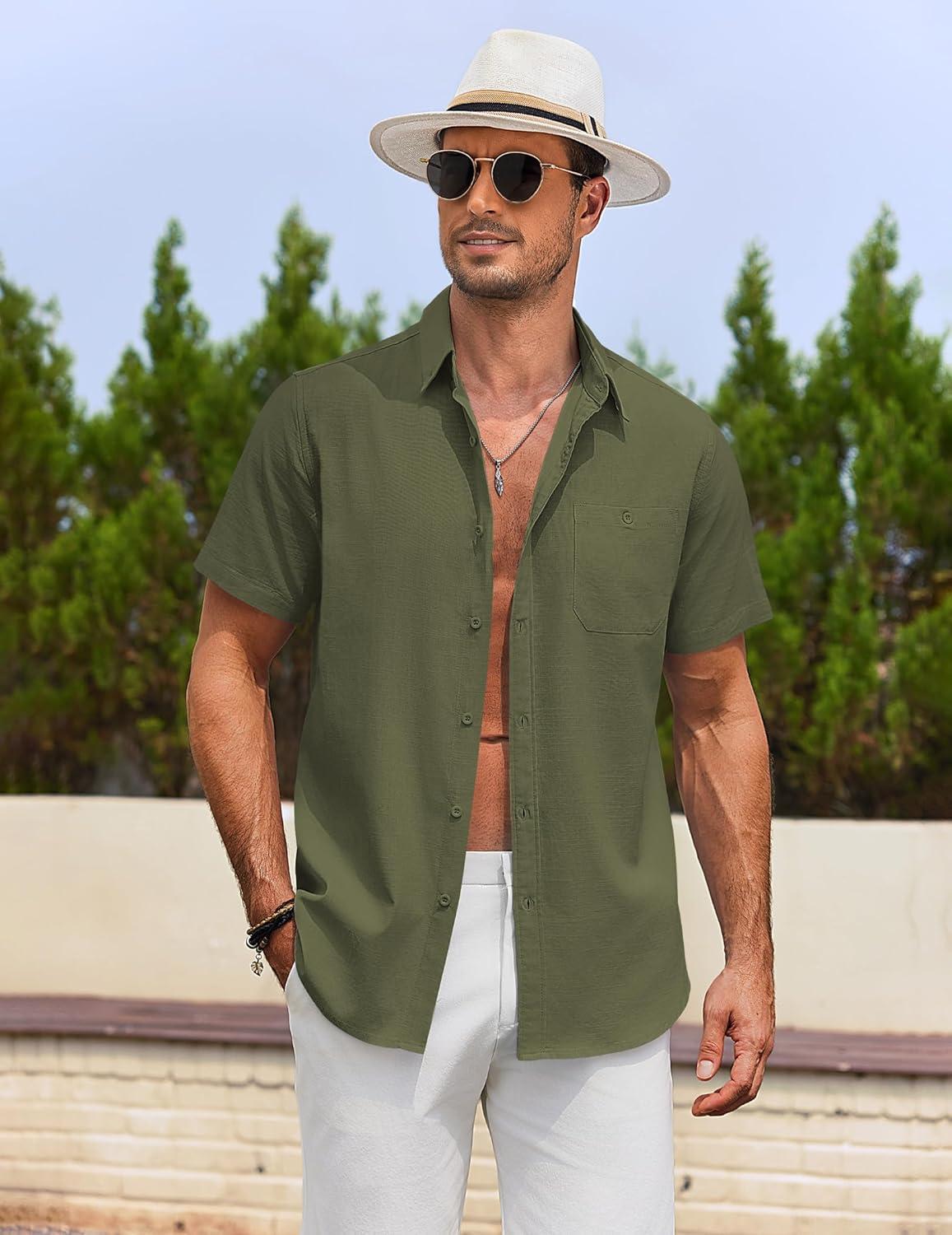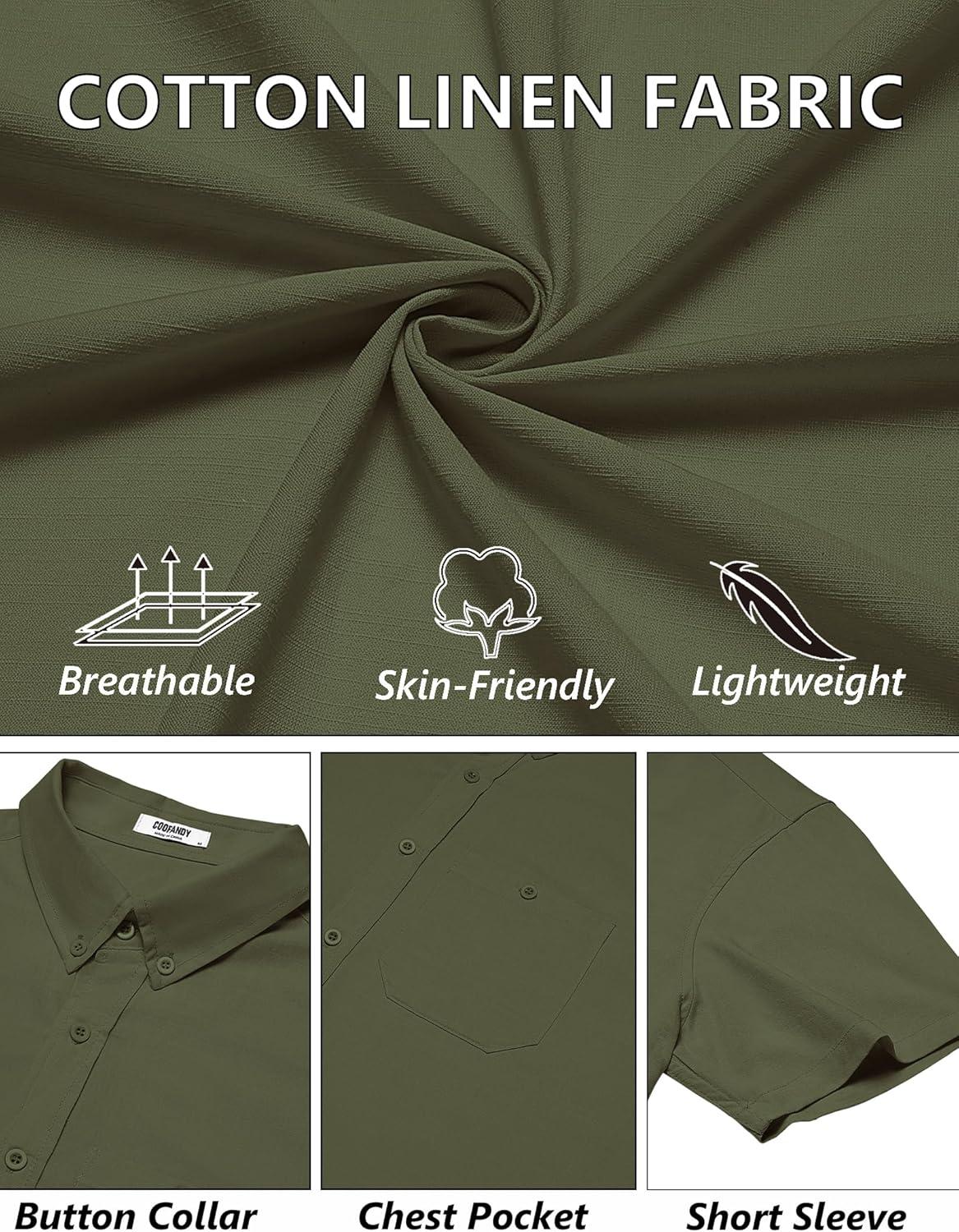 COOFANDY Men's Cotton Linen Shirts Short Sleeve Casual Shirts Summer Button Down Shirt Linen Beach Vacation Shirt(Army Green)
