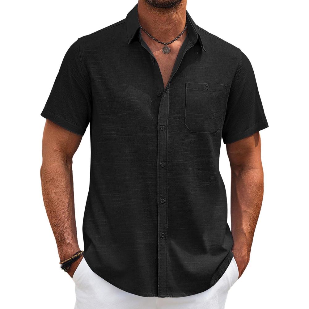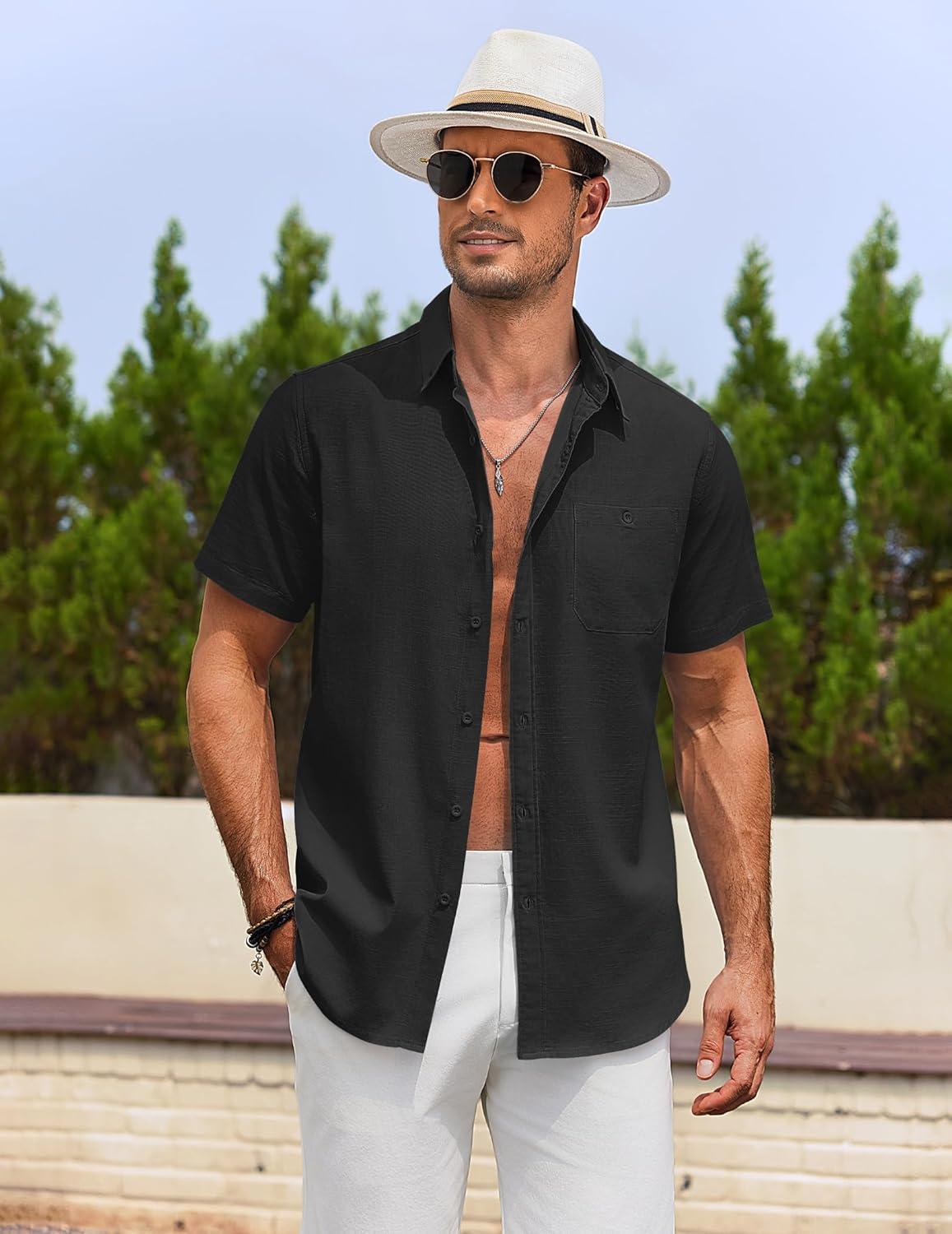 COOFANDY Men’s Cotton Linen Shirts Short Sleeve Casual Shirts Summer Button Down Shirt Linen Beach Vacation Shirt(Black)