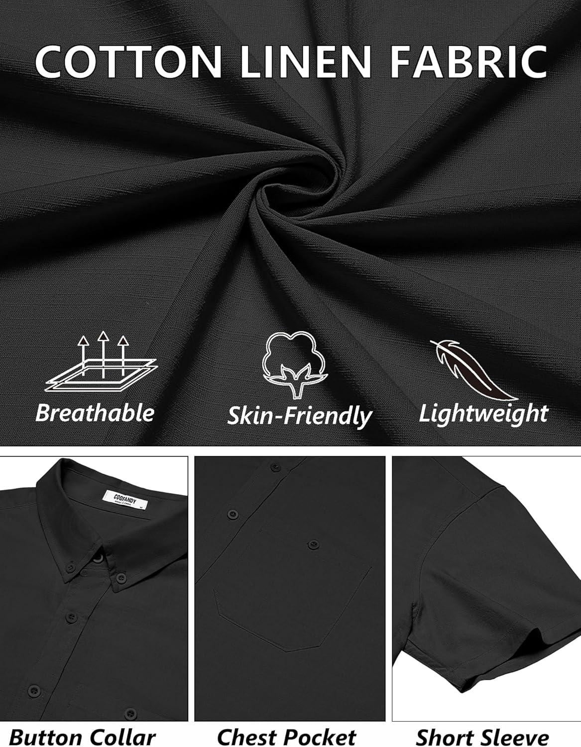 COOFANDY Men's Cotton Linen Shirts Short Sleeve Casual Shirts Summer Button Down Shirt Linen Beach Vacation Shirt(Black)