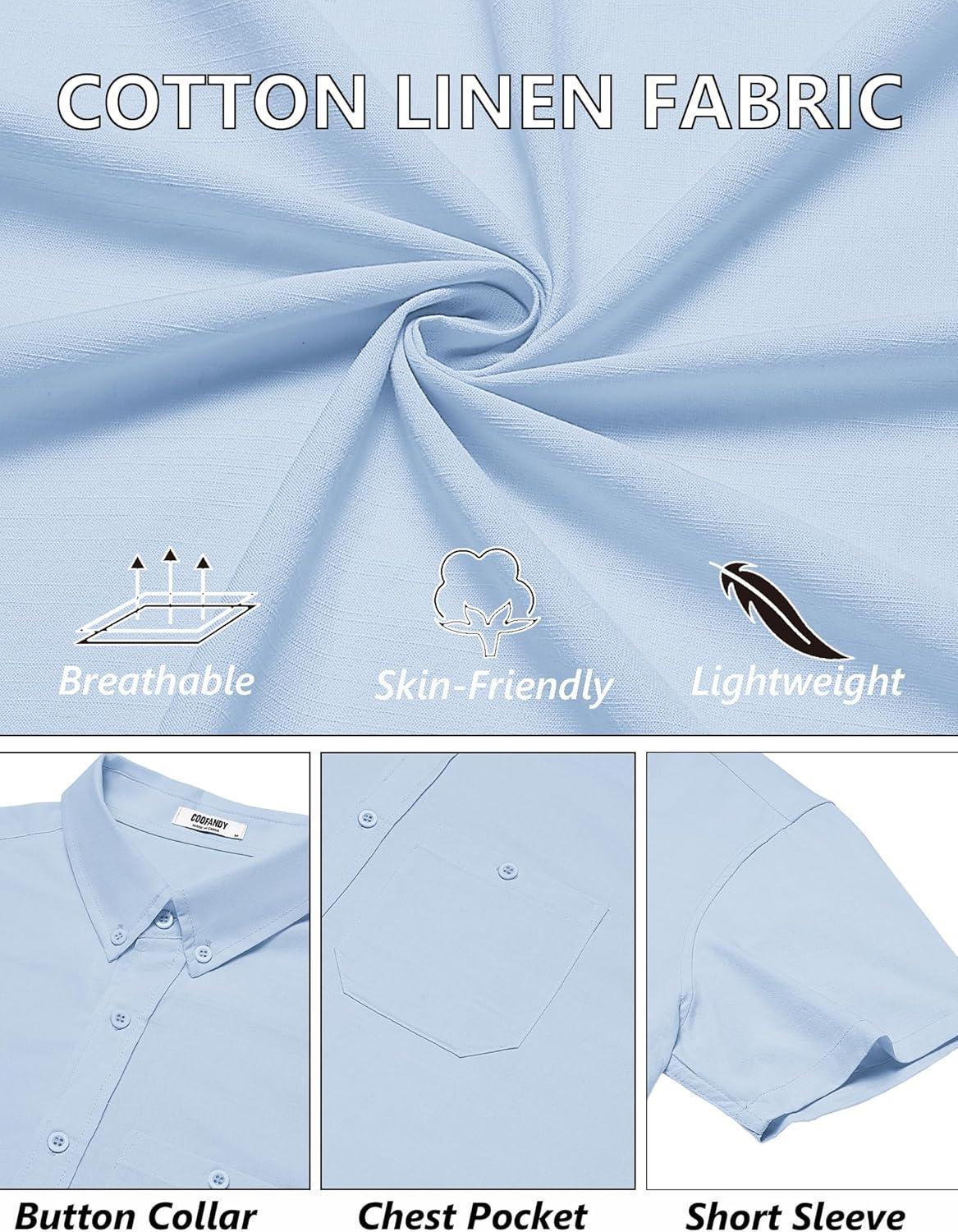 COOFANDY Men's Cotton Linen Shirts Short Sleeve Casual Shirts Summer Button Down Shirt Linen Beach Vacation Shirt(Light Blue)